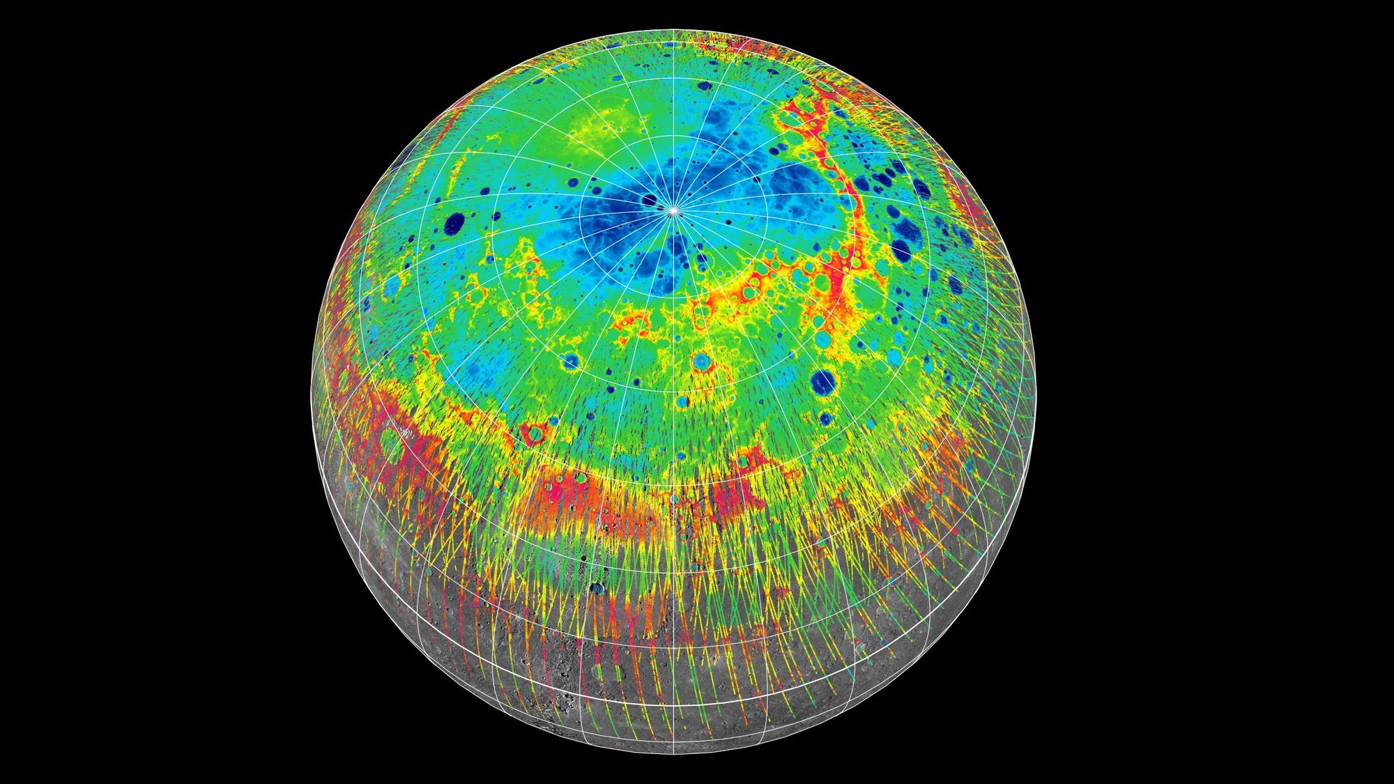 This model shows the altitude profile of the northern hemisphere of Mercury, measured by the laser altimeter on the MESSENGER spacecraft (red is high, blue is low).