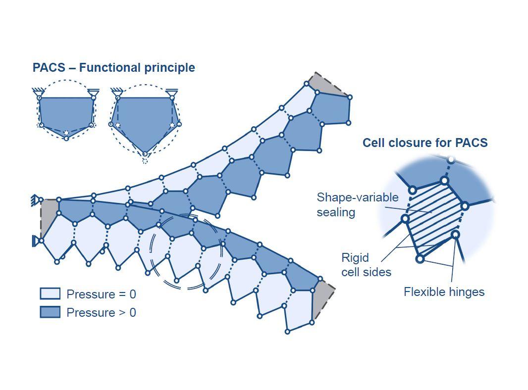 This image shows the operating principle of the Pressure Actuated Cellular Structures (PACS) flap demonstrator using the example of a double-row cantilever and, in detail, the functioning of the PACS cells in the morphing trailing edge.