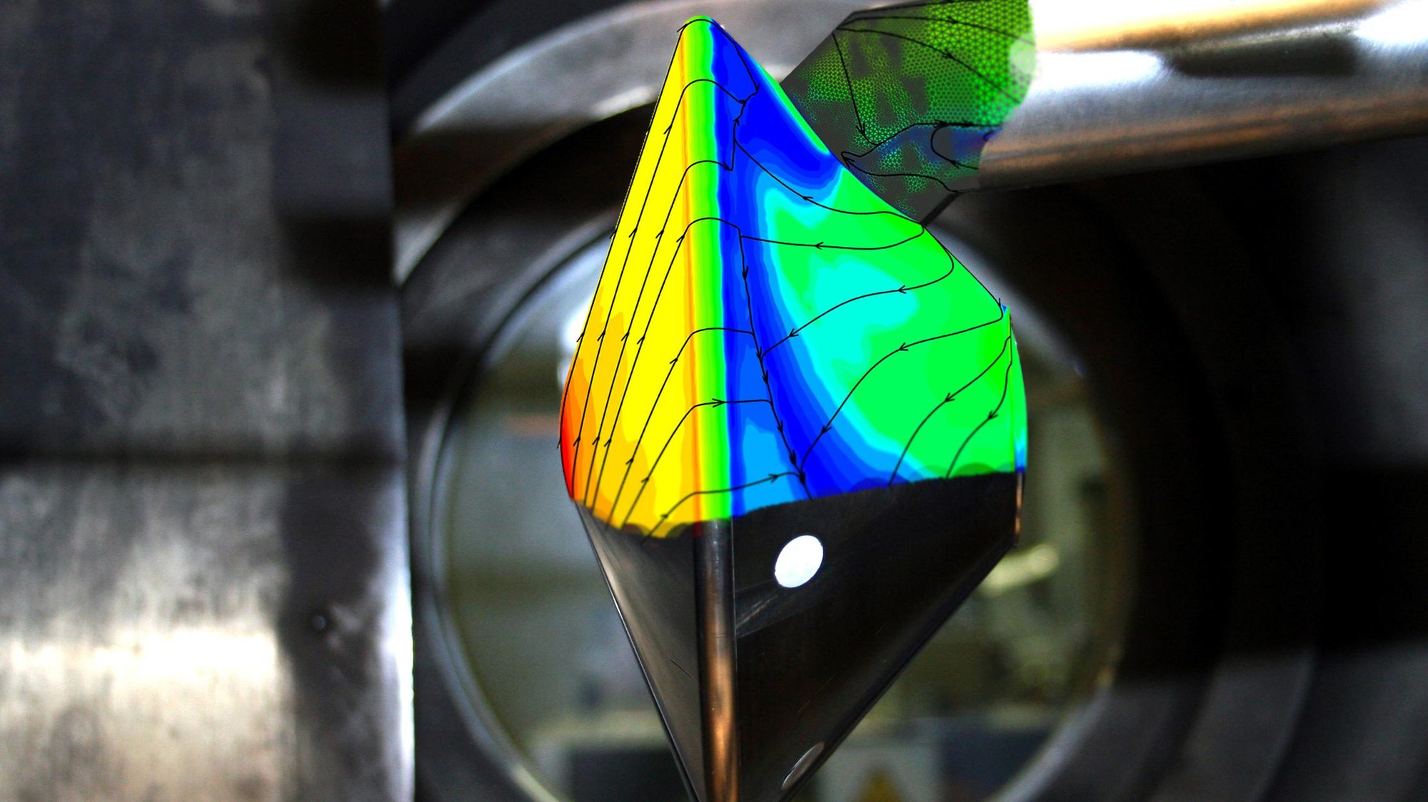 The ExoMars re-entry capsule undergoing tests in a wind tunnel at DLR Göttingen. The experiments were performed on behalf of ESA in the High Enthalpy Shock Tunnel, one of Europe’s largest-scale facilities for the study of hypersonic flight and the re-entry of spacecraft. Carbon dioxide flows at a speed of nearly 16,000 kilometres per hour around the model of the landing capsule. This scenario simulates the flight situation of the capsule in the Martian atmosphere at 40 kilometres above the surface. This generally results in test system temperatures of 6000 degrees Celsius – hotter than the surface of the Sun.