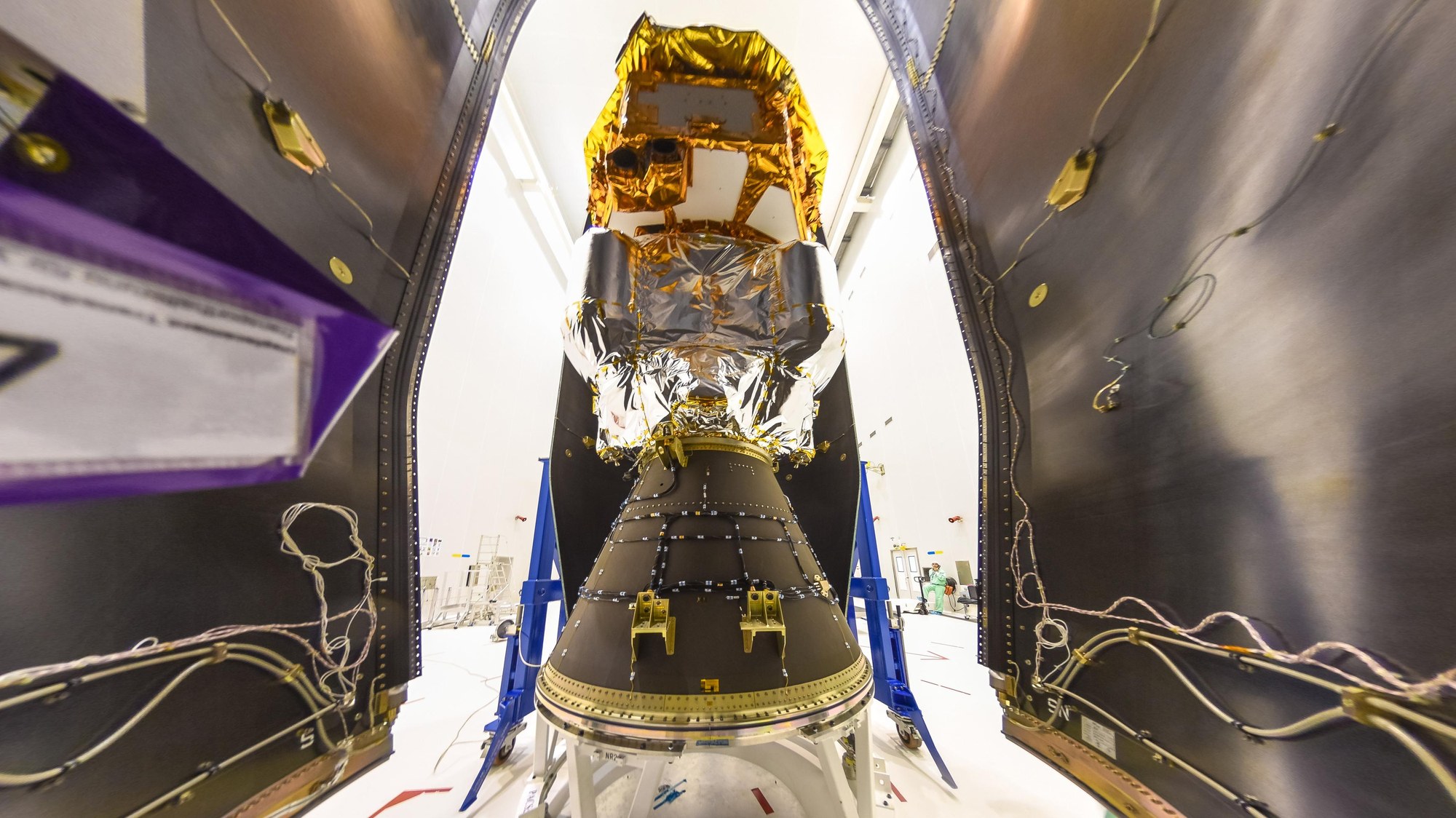 The LISA Pathfinder spacecraft being enclosed in the spacecraft fairing at the European spaceport in Kourou, French Guiana.
