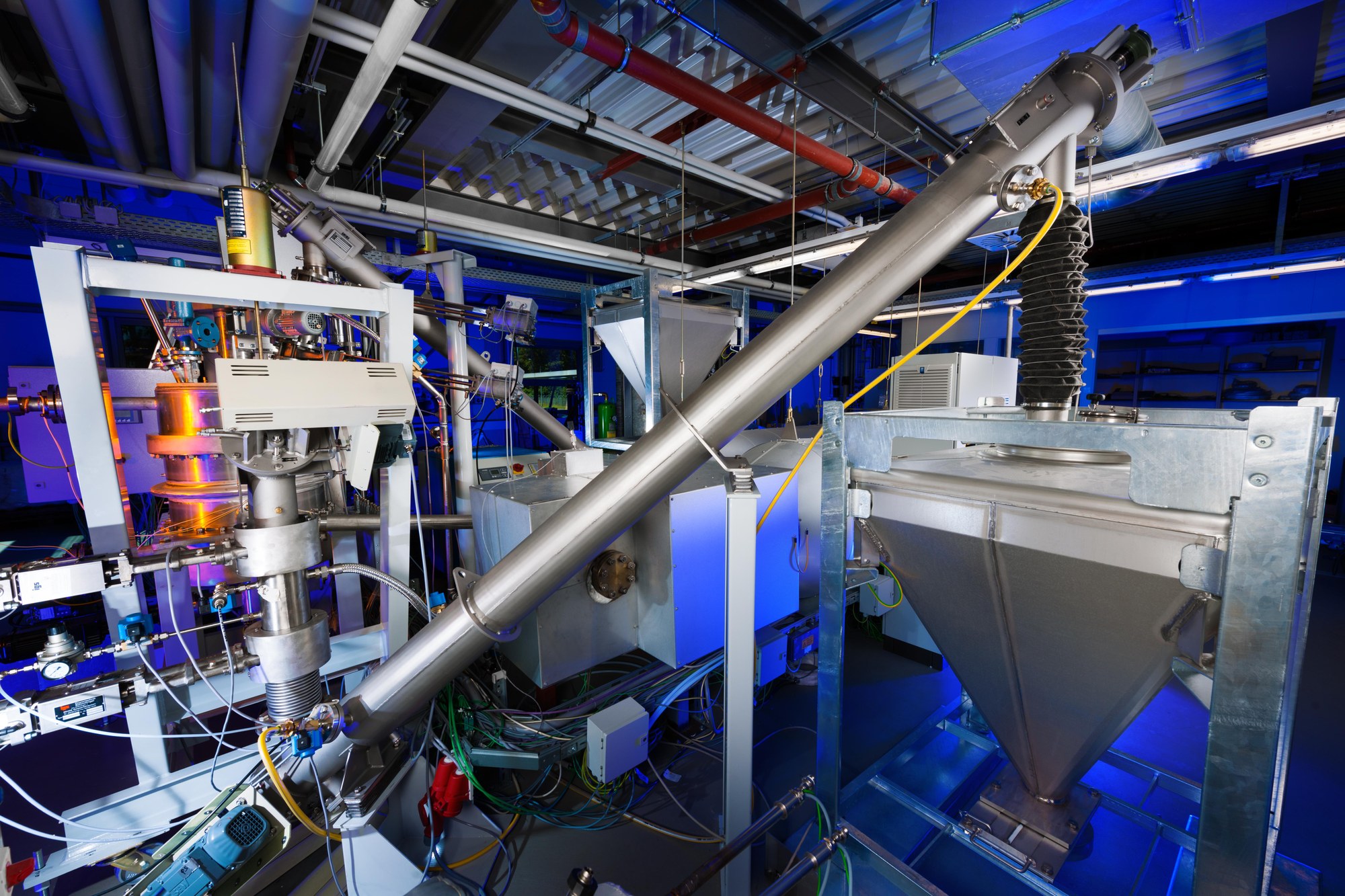 It is possible to feed in any desired amount of lime in powder form using a silo. The lime is burned as its flows through stainless steel pipes and can thus store the heat.