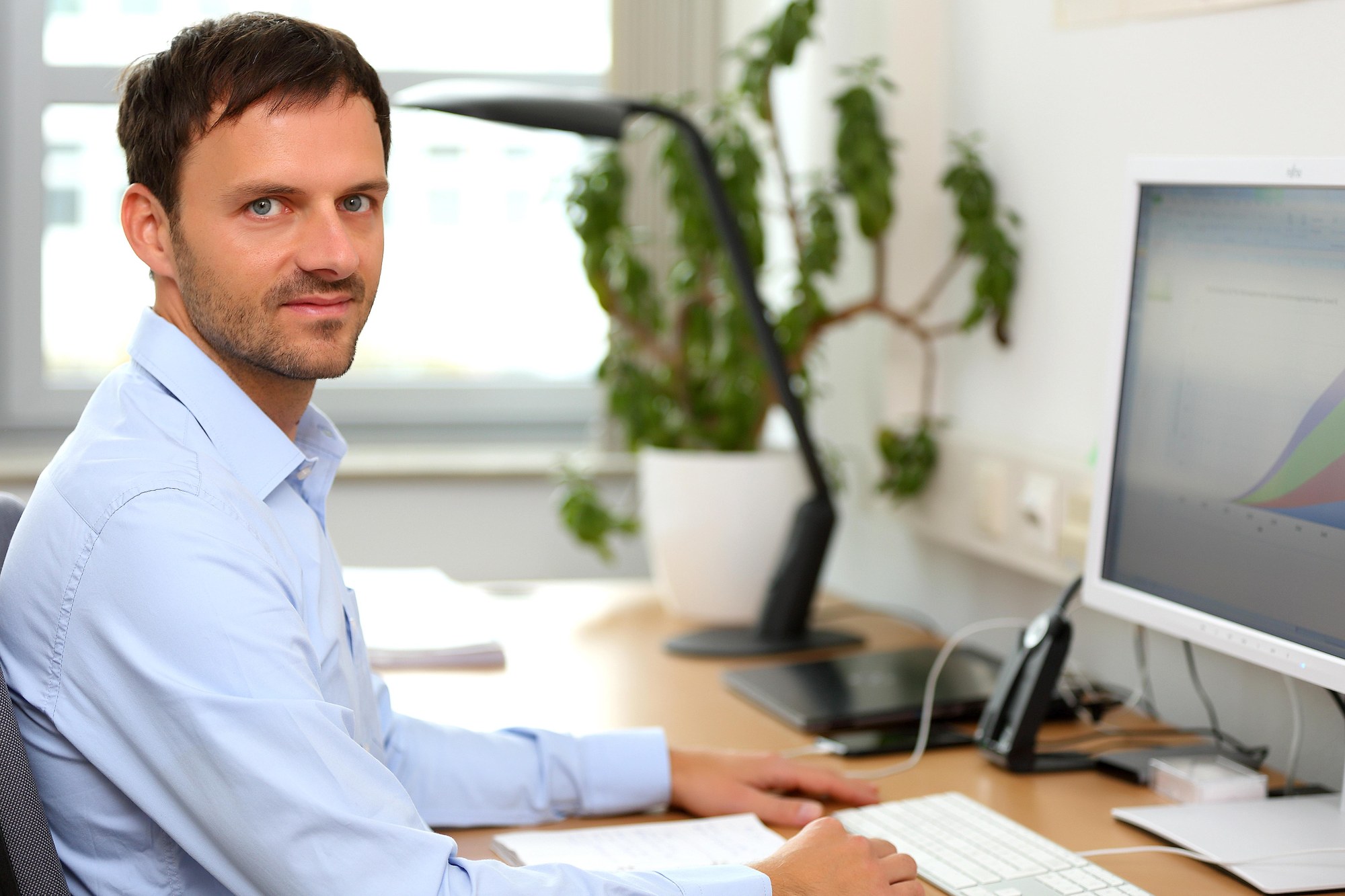 Geographer Stefan Trommer at his workstation in the DLR Institute of Transport Research in Berlin where, among other things, he looks at the question of how new technologies will influence mobility.