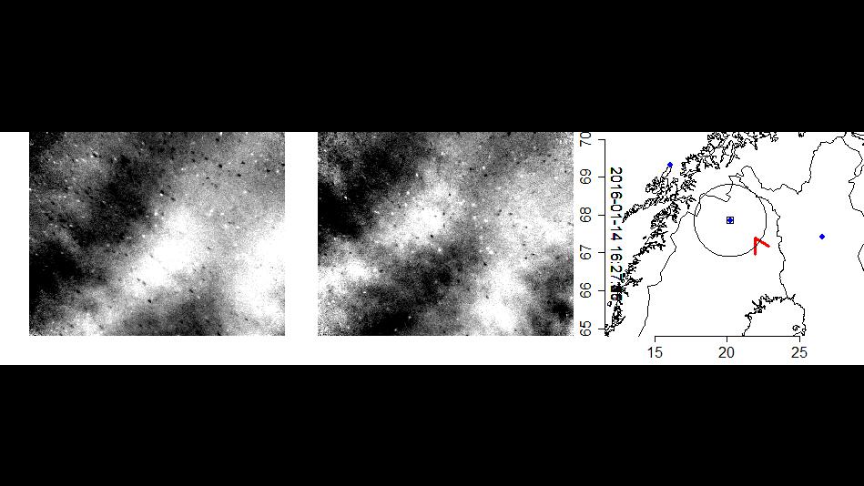 The first two images show changes in a gravity wave field within a few seconds. The black and white points are stars that have not been entirely eliminated and are, in fact, amplified by the differential imaging. The image on the far right shows a map of northern Scandinavia. The red arrow represents the position of the DLR Falcon research aircraft at the time of image acquisition. The blue dots are ground-based measuring stations.