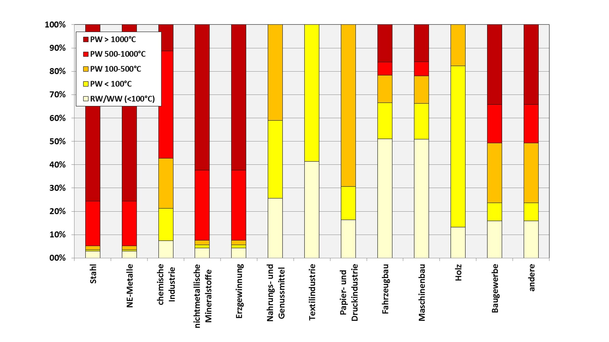 Share of final energy consumption for heat (space heating/warm water (RW/WW) and process heat (PW) in different temperature ranges