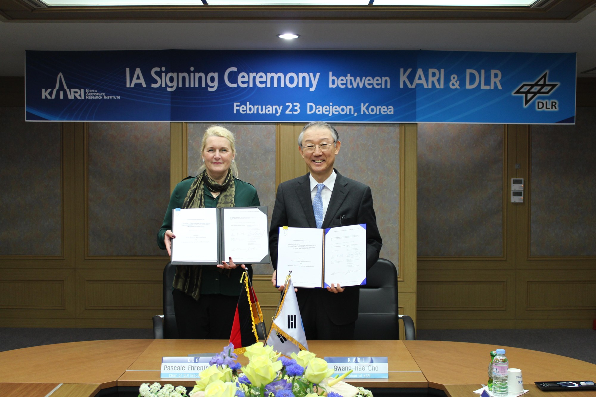 Pascale Ehrenfreund, Chair of the DLR Executive Board, and Cho Gwang Rae, President of the Korea Aerospace Research Institute (KARI), at the contract signing.