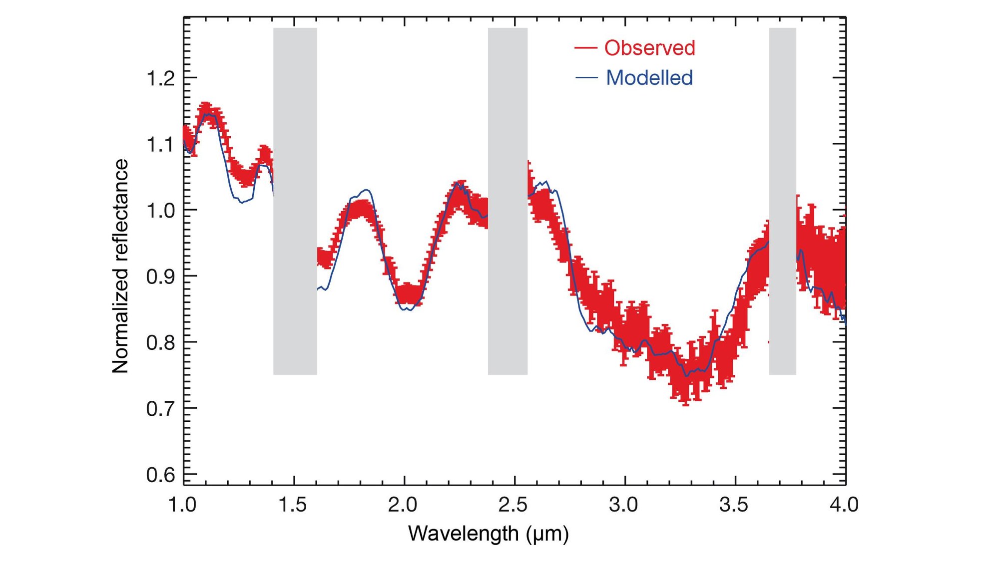 This graph shows variations in the normalised reflectance of a bright spot in the Imhotep region, plotted against wavelength. The measurements show the spectral curve at near infrared wavelengths in the band from one to four micrometres. The red curve shows the individual measurements with error bars; the blue curve shows the modelled reflectivity, which is almost identical to the results of the measurements on the comet. The notches at 1.5 microns, 2.0 microns and at 3.0 microns are diagnostic of water ice.