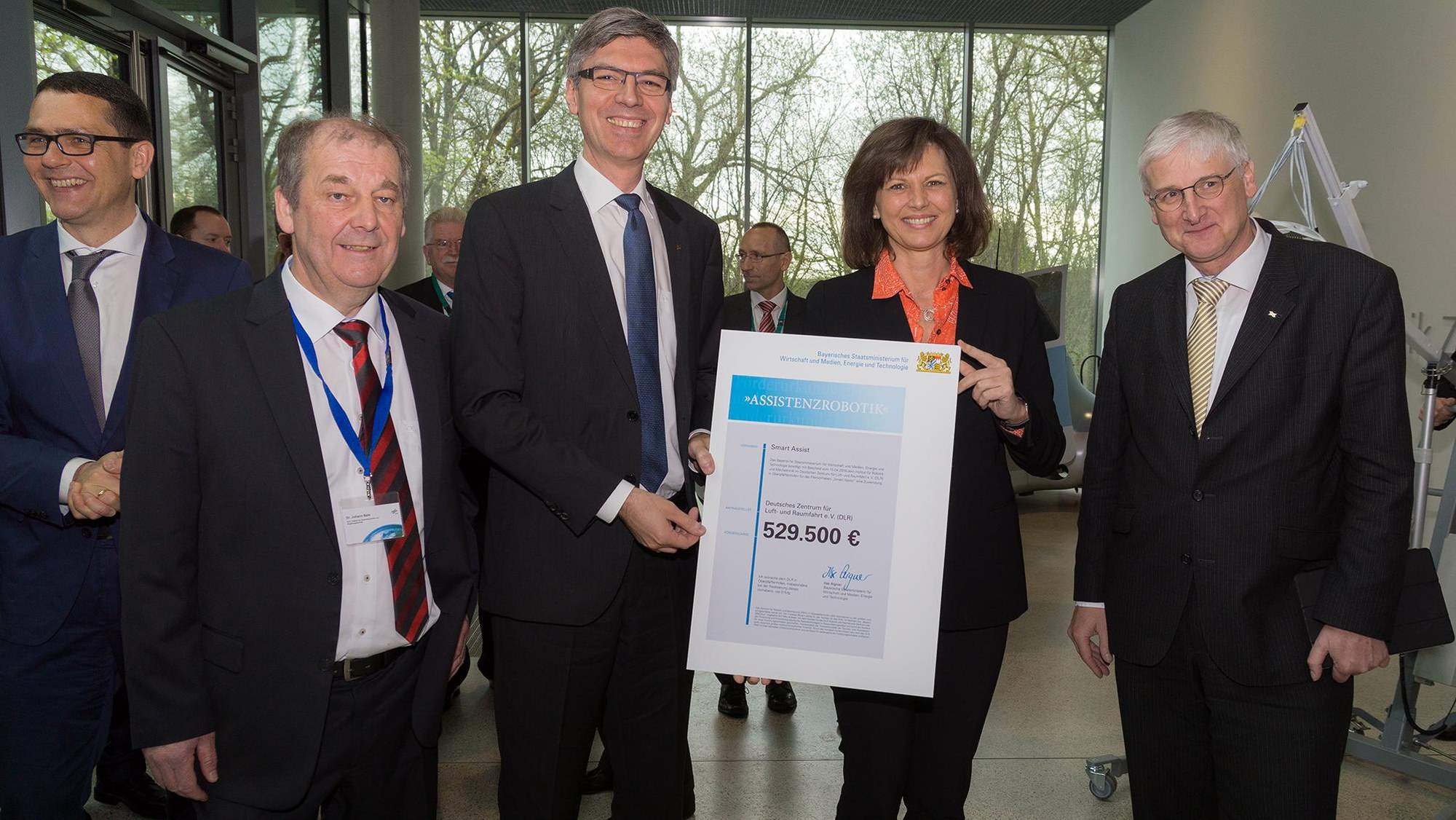 At the opening ceremony, German Federal Minister Aigner presented the DLR Robotics and Mechatronics Center with a government grant of 500,000 euro for the continued expansion of the RMC’s competencies. Pictured (from left): Holger Schlienkamp, at the German Federal Ministry of Economy Affairs and Energy, Johann Bals, Director of the DLR Institute of System Dynamics and Control, Alin Albu-Schaffer, Director of the DLR Institute of Robotics and Mechatronics Ilse Aigner, Bavarian State Minister for Economic Affairs, Media, Energy and Technology and Deputy Prime Minister, and Hansjörg Dittus, DLR Executive Board Member for Space Research and Technology.