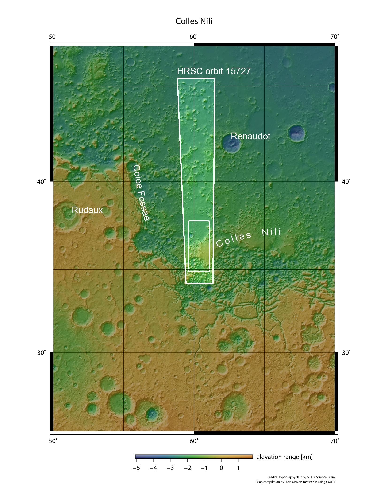 One of the most striking topographic features of Mars is its pronounced ‘dichotomy’ – its division into an older highland region littered with craters to the south of the equator and lowland plains in the north of the planet. The transition between the lowlands and the highlands is mostly marked by a steep escarpment, the foothills of which contain numerous inselbergs or ‘escarpment outliers’ that could be remnants of the highland region that have withstood erosion. In these images of Colles Nili, the ‘Hills of the Nile’ region, signs of glacier and ice activity can frequently be observed along the dichotomy boundary, which reveal heavy glaciation in the past.