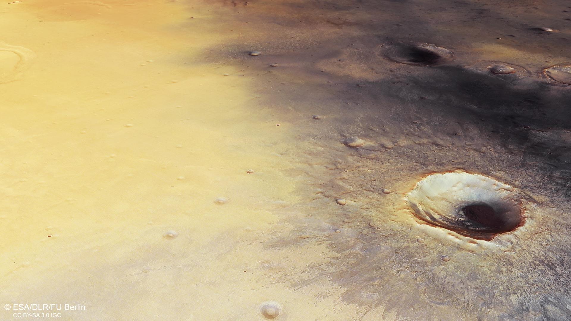 On 19 October, the ESA landing demonstrator Schiaparelli (Entry, Descent and Landing Demonstrator Module, EDM) will land in the Meridiani Planum. Schiaparelli will test different technologies and determine which ones should help the second part of the mission, ExoMars 2020 with the Pasteur Rover as a scientific payload, make a safe landing: Materials for the thermal protection system, a parachute, a radar altimeter and a thruster system for the final landing phase. The crater in the foreground has a diameter of about 25 kilometres.