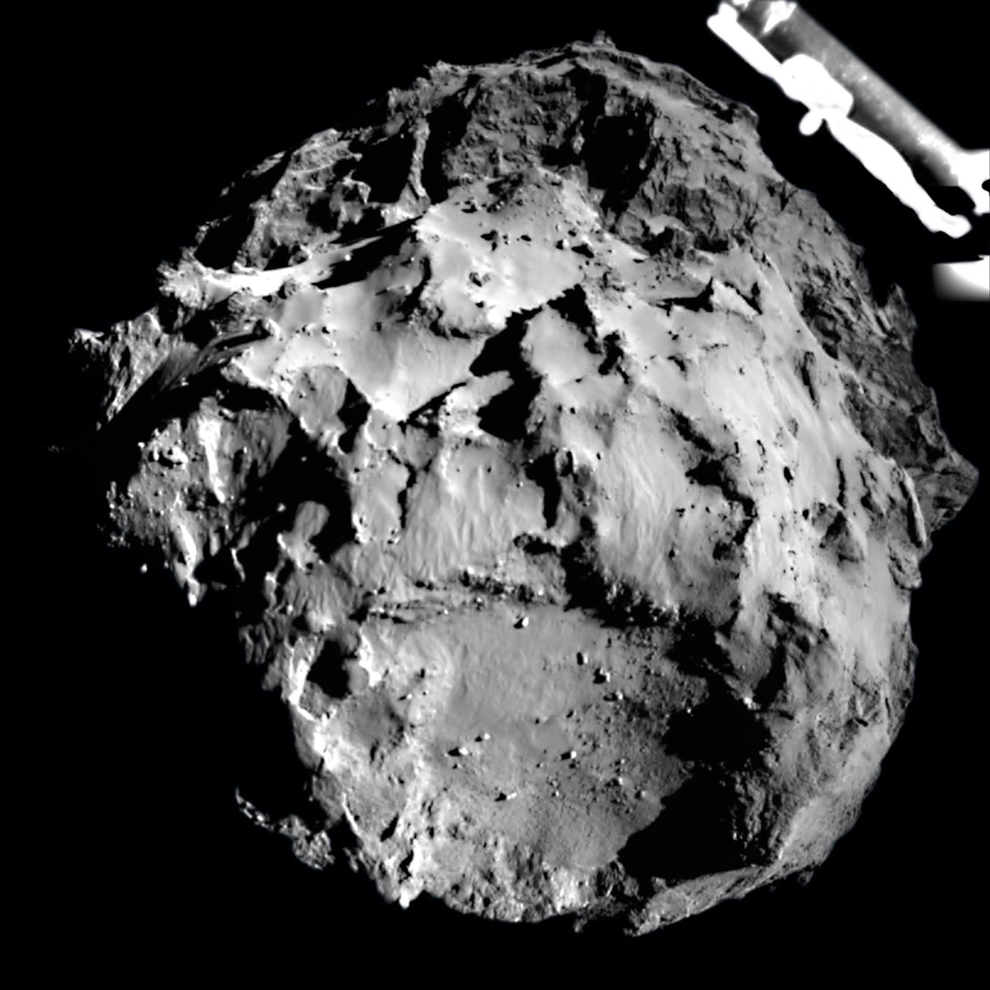 The ROLIS camera, developed by DLR, was activated during Philae's descent to record its gradual approach towards 67P. Agilkia is not yet visible: the landing site comes into the camera's view a little later. At the top right we see Philae's landing gear.