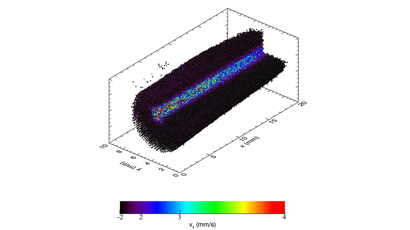 Reconstructed particle motion in the entire, three-dimensional particle cloud with shear flow caused by laser excitation.