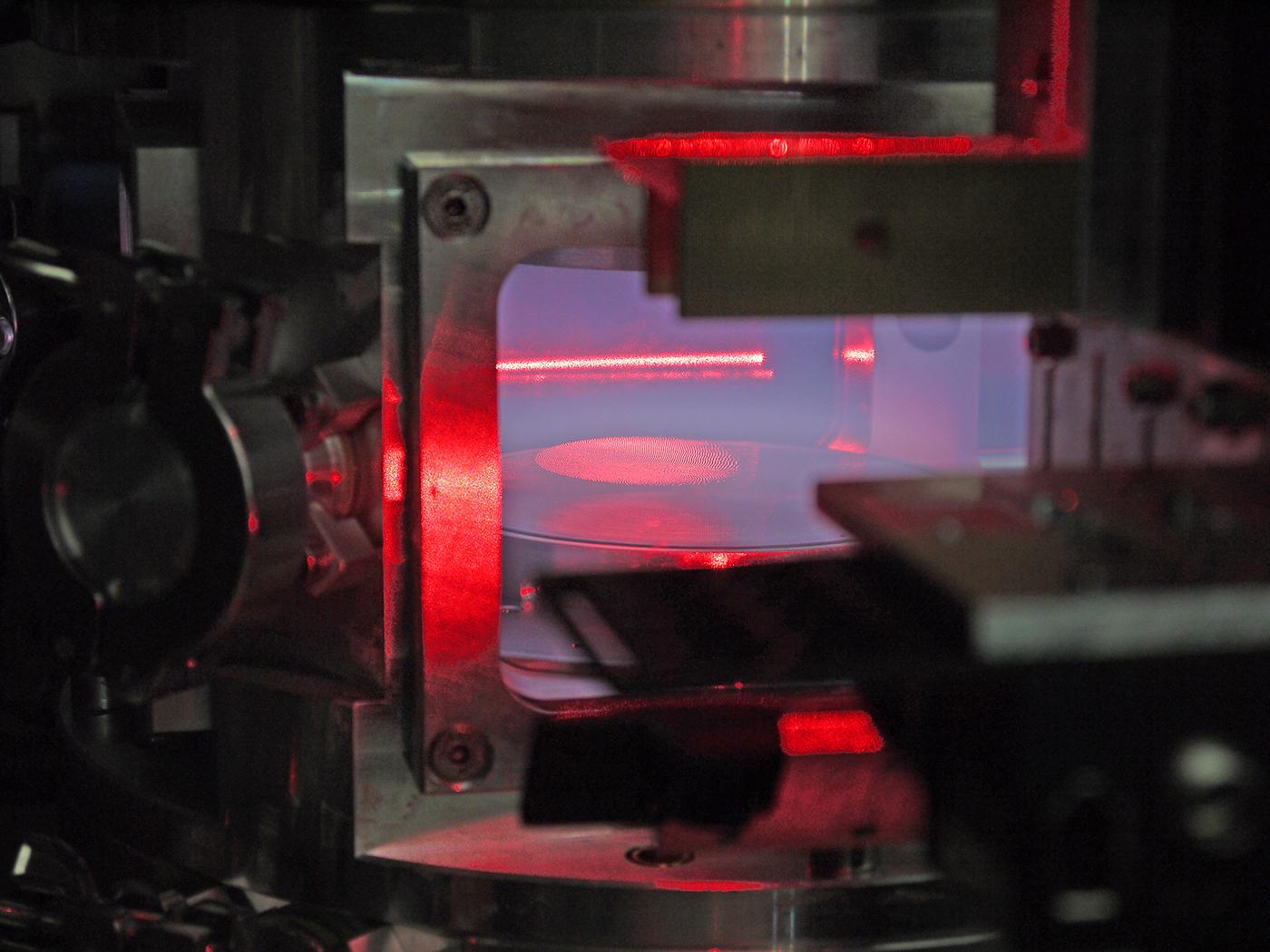 A two-dimensional plasma crystal was created in the ZyFlex chamber, where it floats like a 'red oval cloud’ above the lower electrode.