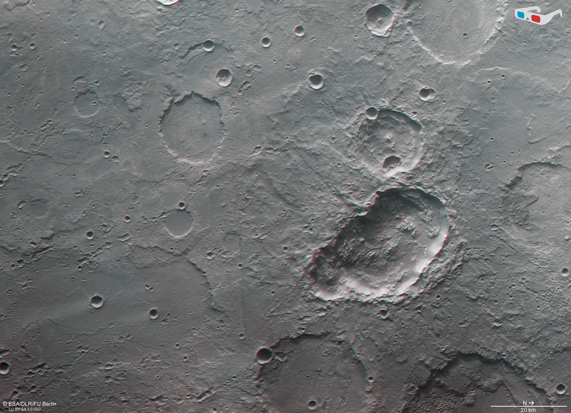 So-called anaglyph images can be created from the nadir channel of the HRSC camera system operated by DLR on board the ESA space probe Mars Express, which is directed vertically onto the surface of Mars, and the oblique view from one of the four stereo channels. When using red-blue or red-green glasses, they make a realistic, three-dimensional view of the landscape possible.