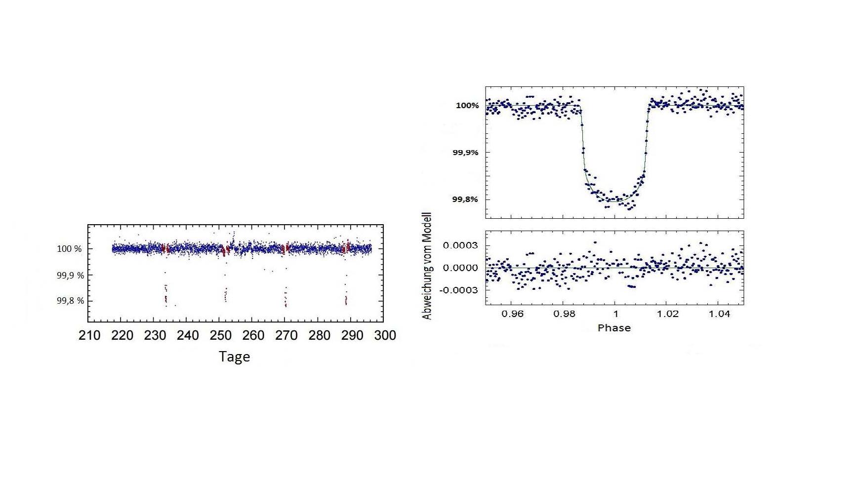 Light curve of the star M2-99 over a period of about three months. The spurious contributions from the instrument and the star were removed. The planet dims the star by 0.2 percent every 18 days. When the four transit events are superimposed, the lower phase curve is obtained, which differs very little from a model curve with clear planetary parameters.