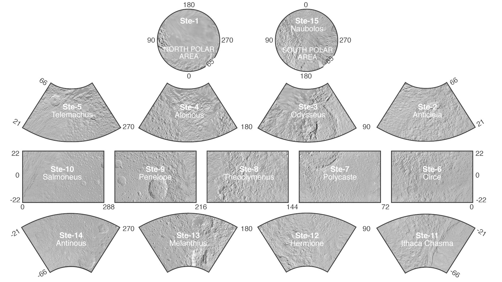 Measuring 1062 kilometres in diameter, Tethys is the fifth largest of Saturn’s moons. The camera system on Cassini managed to capture the moon three times during a close flyby and hence obtain global coverage in high resolution. The names of the landscape features on Tethys and the map sheets themselves are taken from characters and places portrayed in Homer’s Odyssey.