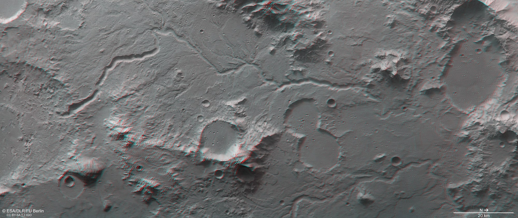 Anaglyph images can be generated from data acquired by the nadir channel of HRSC, which is aligned perpendicular to the surface of Mars, and one of the four stereo channels, which look forward and backwards along the spacecraft’s flight path. These provide a realistic three-dimensional view of the landscape when viewed using red and blue or red and green glasses. North is on the right of the image. The deeply carved drainage channels are clearly discernible, as is the levelling-off of some impact craters by solidified, low-viscosity lava.