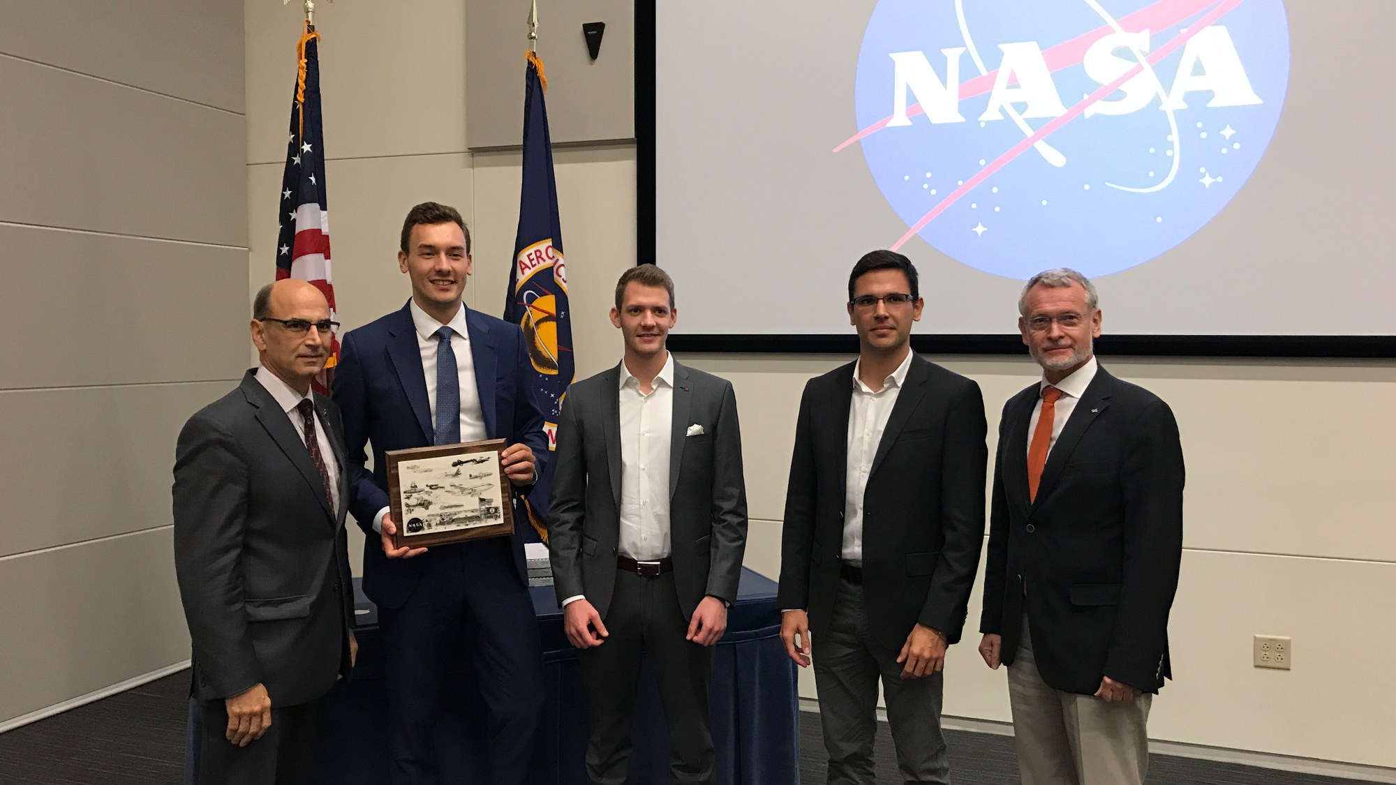 George Finelli, Director of Aeronautics Research at NASA Langley Research Center, Christian Decher, Daniel Metzler, Soma Varga (winning team from TU Munich) and Horst Hüners, DLR Programme Director for Aeronautics Research.
