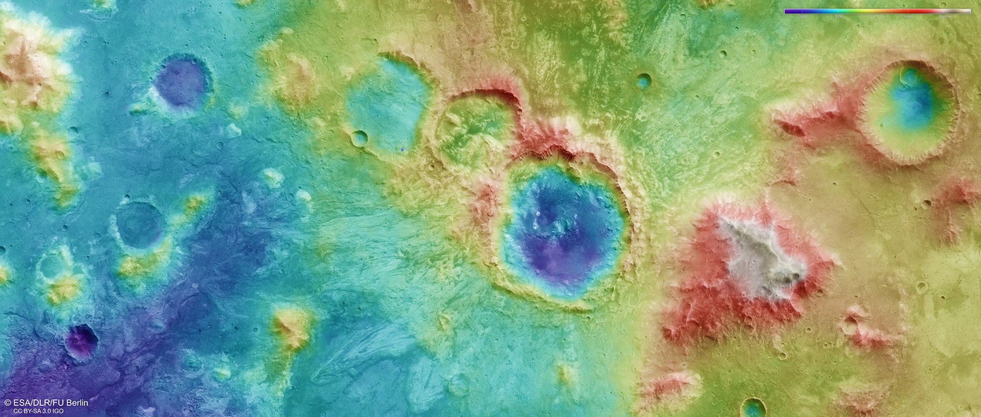 Digital terrain models of the Martian surface can be generated with an accuracy of up to 10 metres per pixel from the nadir channel directed vertically onto the Martian surface and the stereo channels of the High Resolution Stereo Camera (HRSC) on Mars Express. In this colour-coded image, the absolute elevations above a reference level, the Areoid (derived from Ares, the Greek word for Mars), are well depicted. These elevation values can be read based on the colour scale at the top right of the image. The colour differences clearly show the height difference between the ramparts and the crater floor.