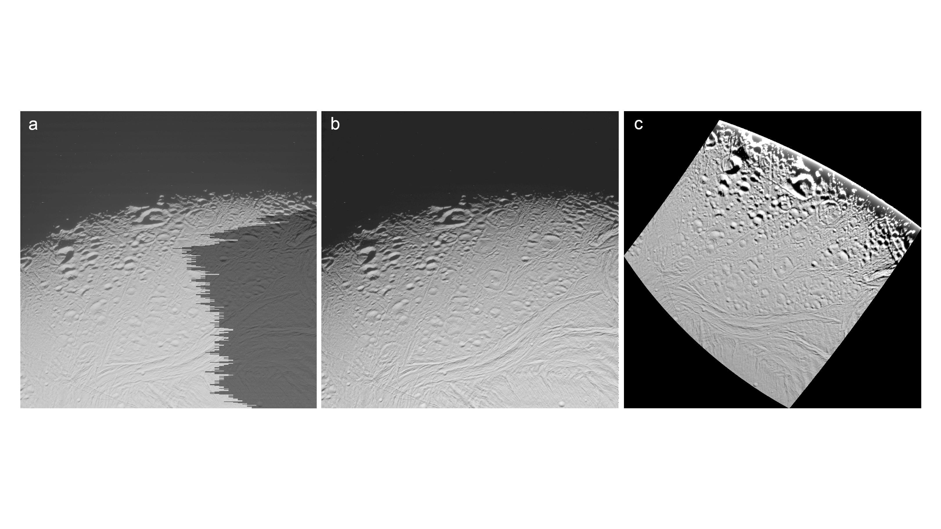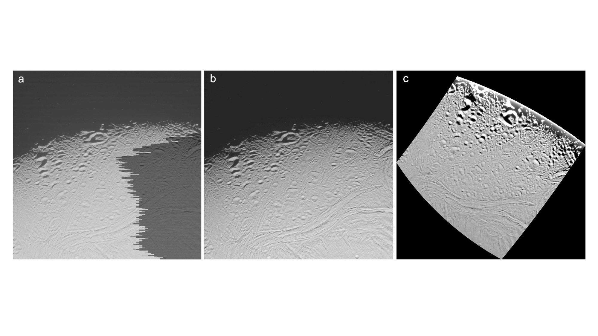 The final stage involves a geometric correction of the images to ensure that all objects are shown correctly relative to the surface and each other and that there is no offset from the edge of one image to the next. The images are then converted into the chosen map projection (right) and fitted together to produce a global mosaic.