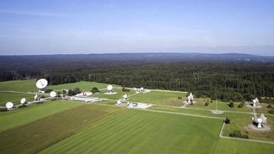 Aerial view of the DLR ground station in Weilheim. The individual antenna stations at Weilheim can be operated independently – which means that the Weilheim ground station can support several missions simultaneously (multi-mission operation). All antennas and station facilities are monitored and controlled from one common control room.
