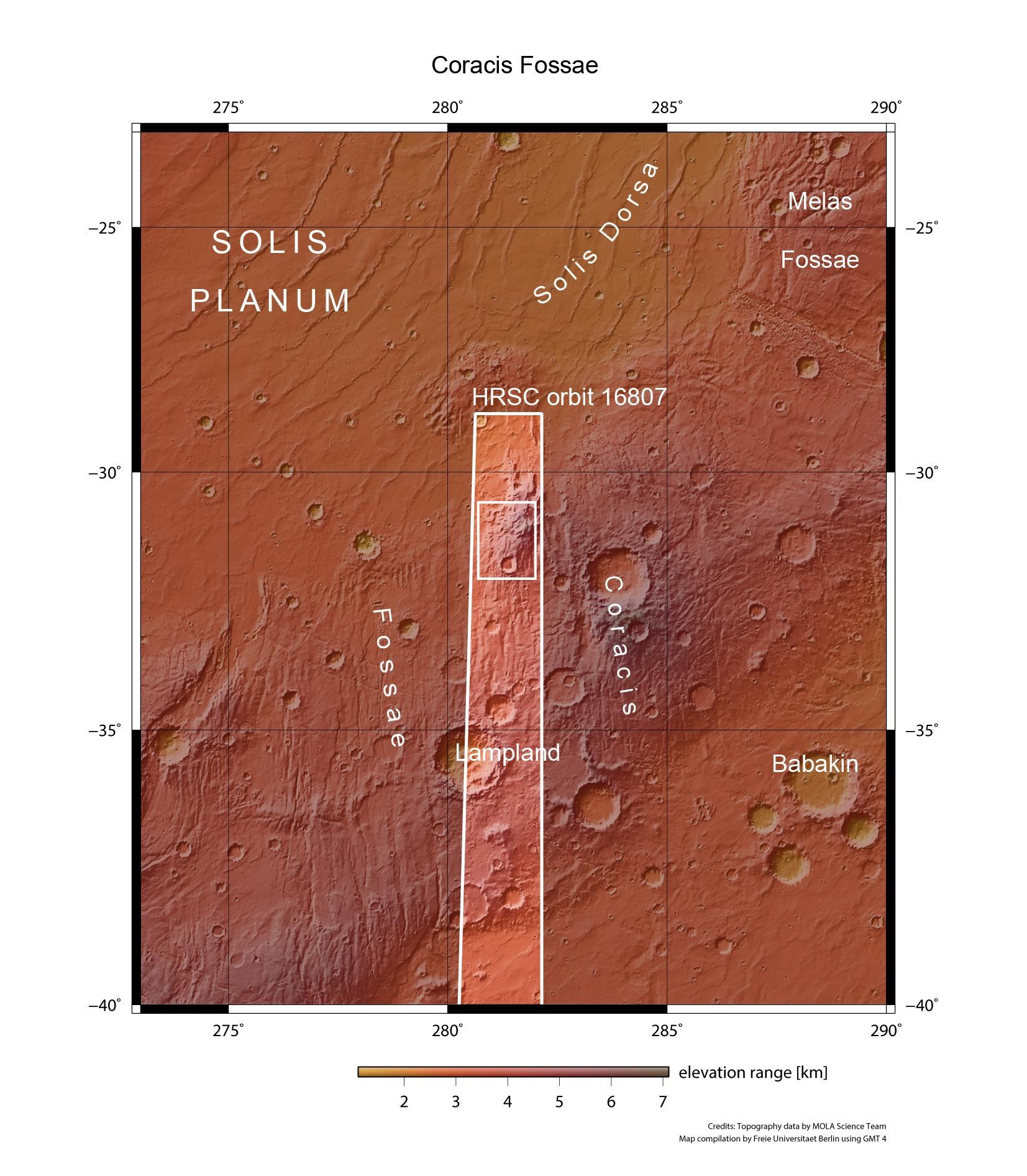 This overview map shows a section of the Coracis graben in the Thaumasia highland region. The area is characterised by mountains, tectonic graben, impact craters, fluvial valleys and periglacial structures (shapes that only occur in permafrost regions). The colour coding of the image highlights elevation differences in the surface. The images described in the article come from the small rectangle within the strip of images acquired by the HRSC camera, operated by DLR, during orbit 16807.