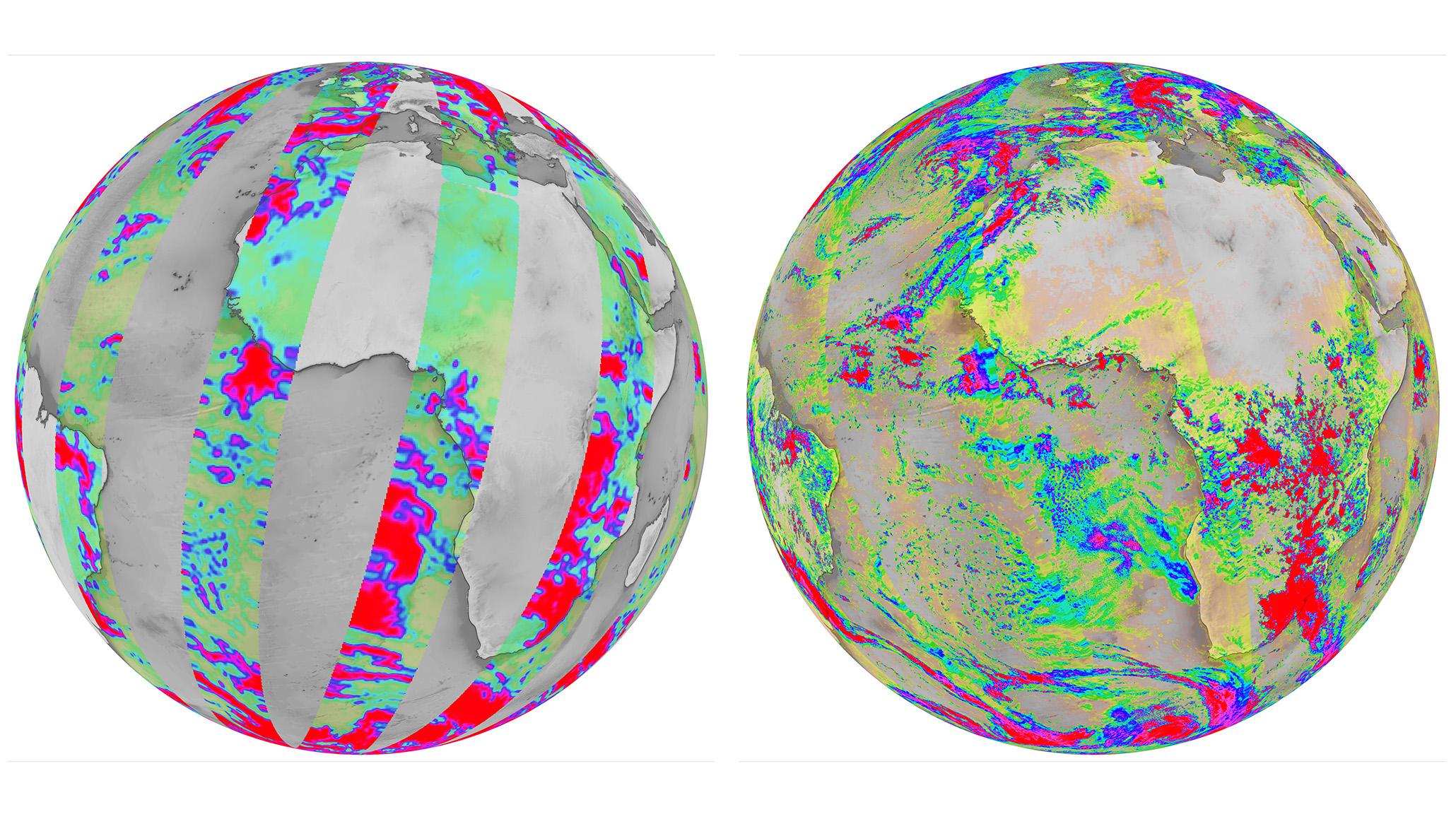 Sentinel-5P records about 20 million measurements a day. This results in a global coverage with a spatial resolution that is about 100 times better than previous atmospheric observation missions. For comparison: cloud measurements on 25 November recorded by GOME-EUMETSAT (left) and Sentinel-5P (right).