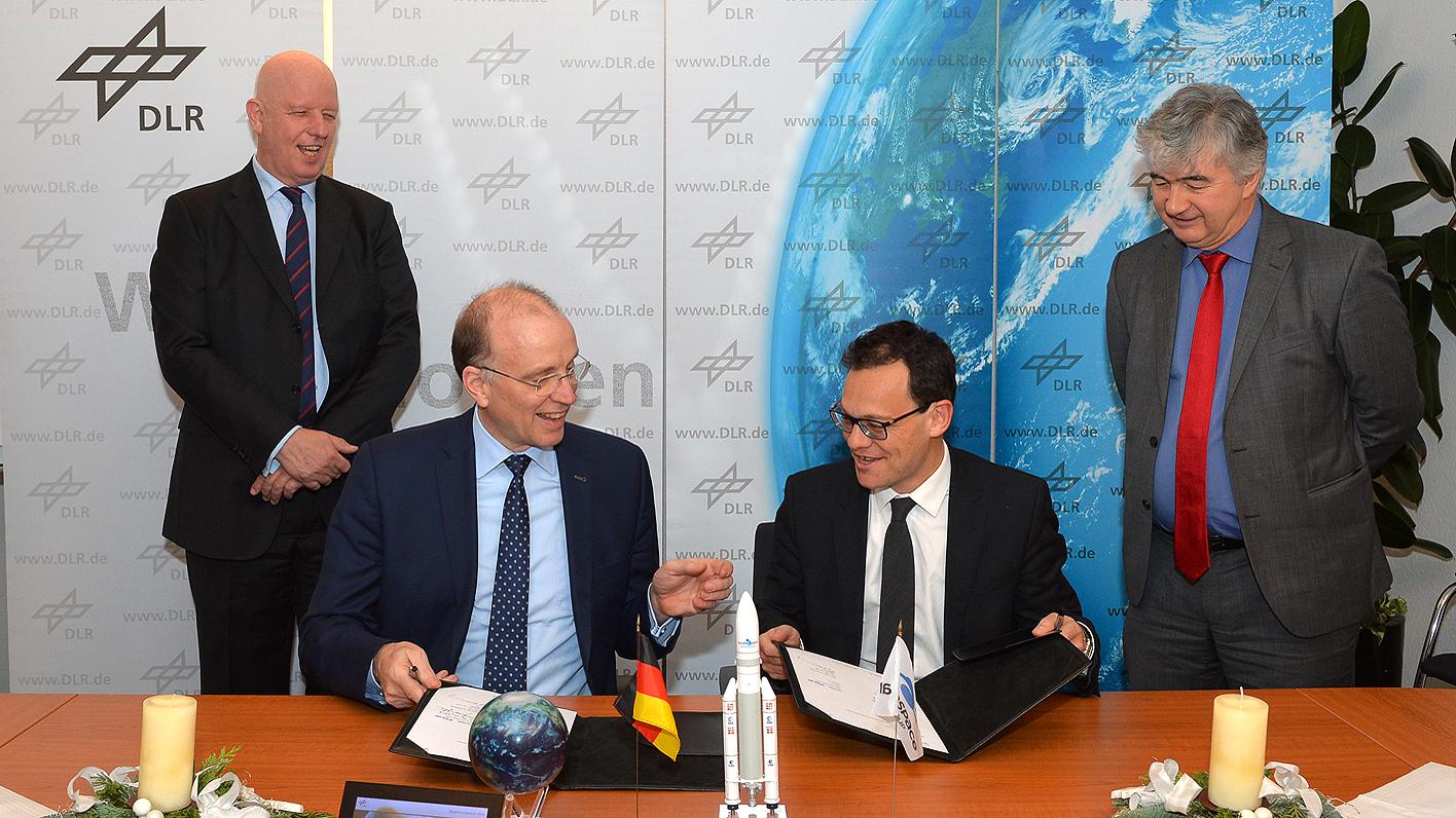 On 14 December 2017, Marco Fuchs, Chairman of OHB System AG (second from the left) and Stéphane Israel (second from the right), CEO of Arianespace, signed the Heinrich Hertz satellite mission launch contract in Bonn, in the presence of Dr Gerd Gruppe (left), DLR Executive Board Member responsible for Space Administration, and Dr. Wolfgang Scheremet, Director General Industrial Policy at the Federal Ministry for Economic Affairs and Energy (BMWi).