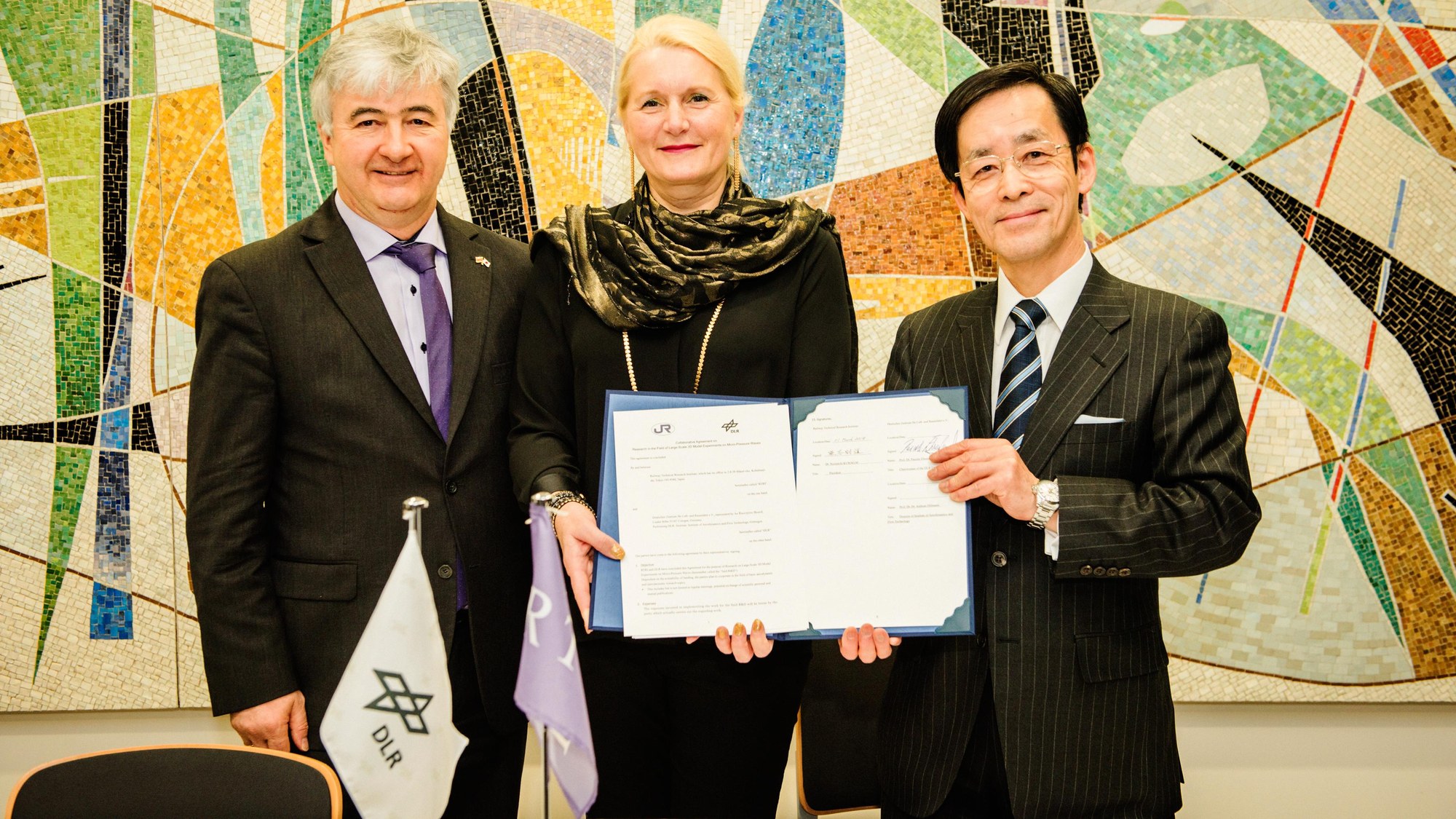 On 1 March 2018, DLR and the Japanese Railway Technical Research Institute (RTRI) signed a cooperation agreement. (from left to right.) Wolfgang Scheremet,Director General of Industrial Policy at the German Ministry for Economic Affairs and Energy, Pascale Ehrenfreund, Chair of the DLR Executive Board and Norimichi Kumagai, President of the RTRI.