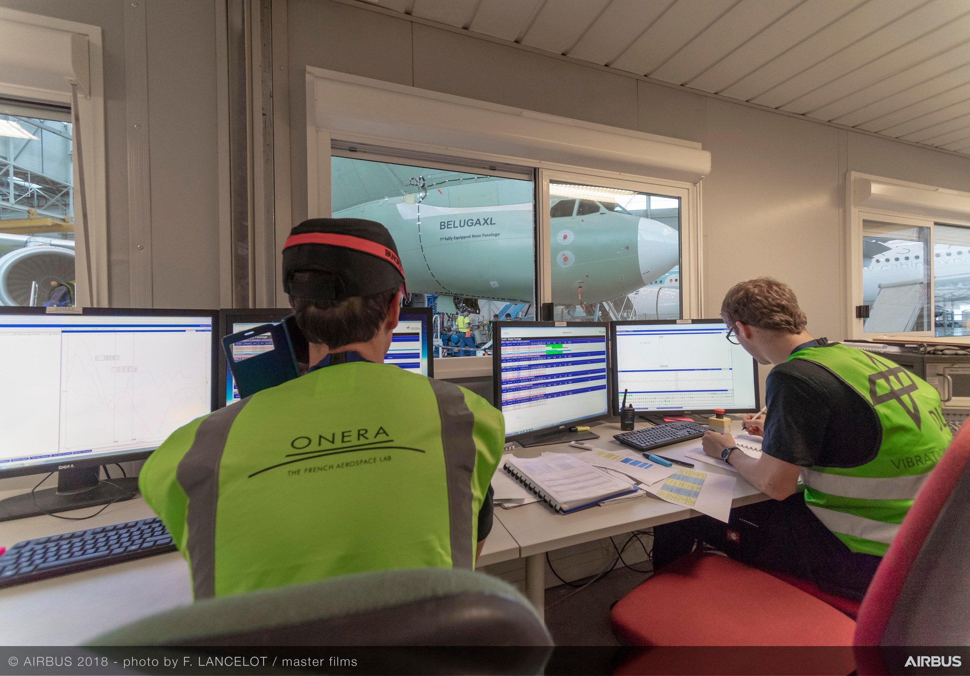 View of the prototype Airbus Beluga XL from the control room. The ground vibration testing was conducted by the German Aerospace Center (Deutsches Zentrum für Luft- und Raumfahrt; DLR) and ONERA (Office National d’Etudes et Recherches Aérospatiales), the French national aerospace research centre.