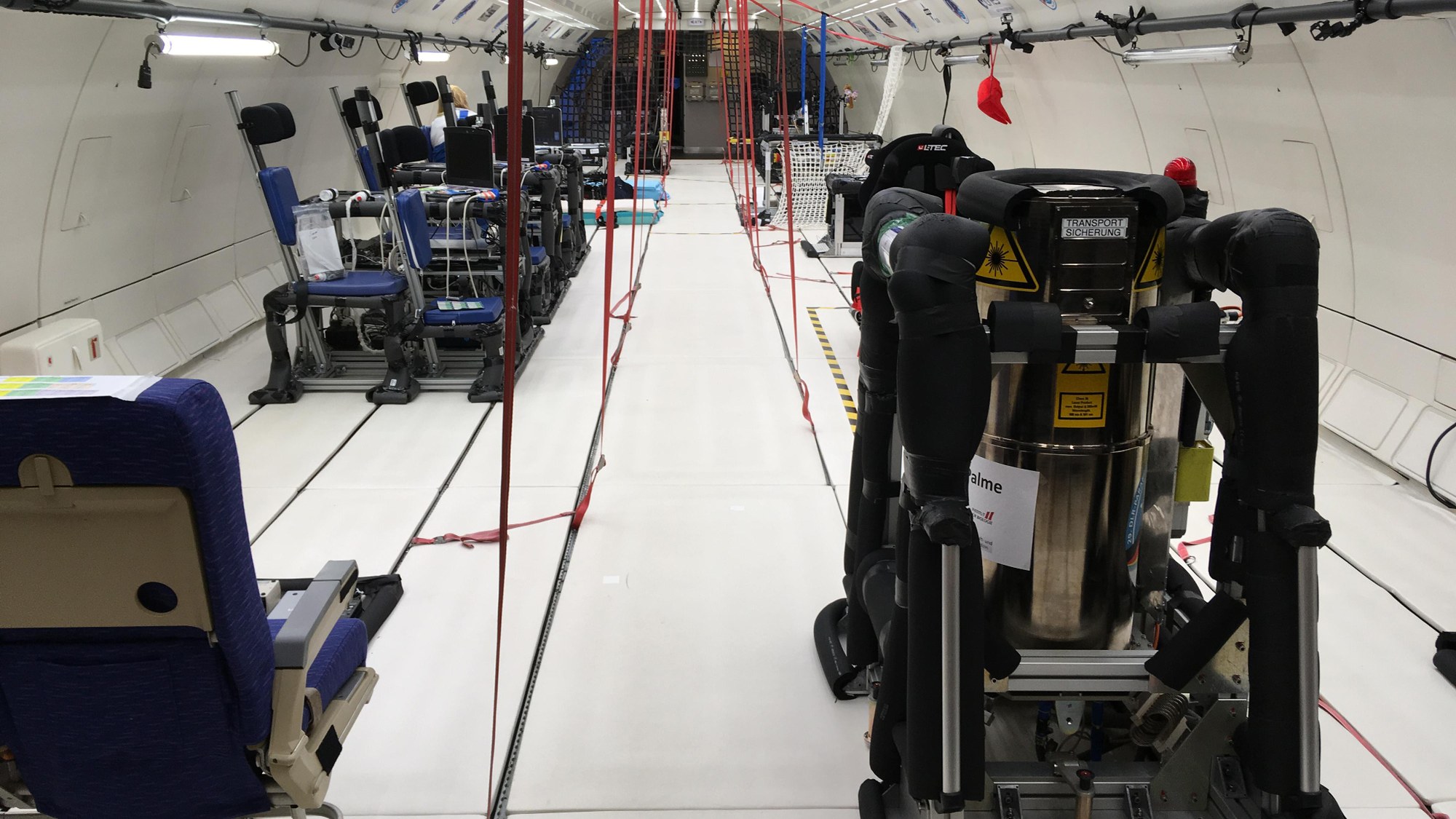 The experimental equipment is firmly bolted down in the cabin of the converted Airbus A310 ZERO-G.