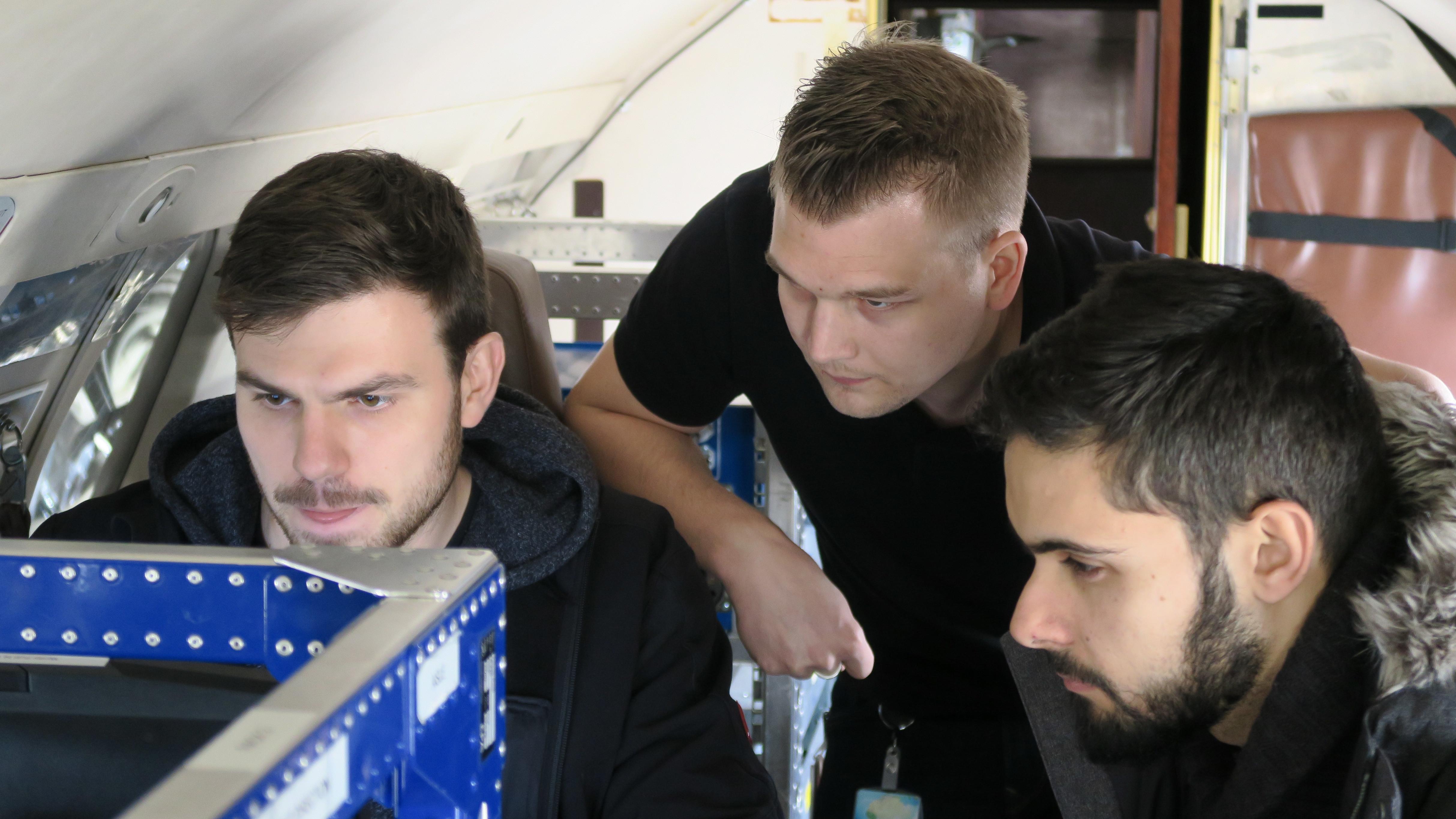 Researchers from the Institute of Communications and Navigation (from left to right: Nils Mäurer, Daniel Mielke and Guiseppe Battista) in the Falcon research aircraft preparing for take-off.
