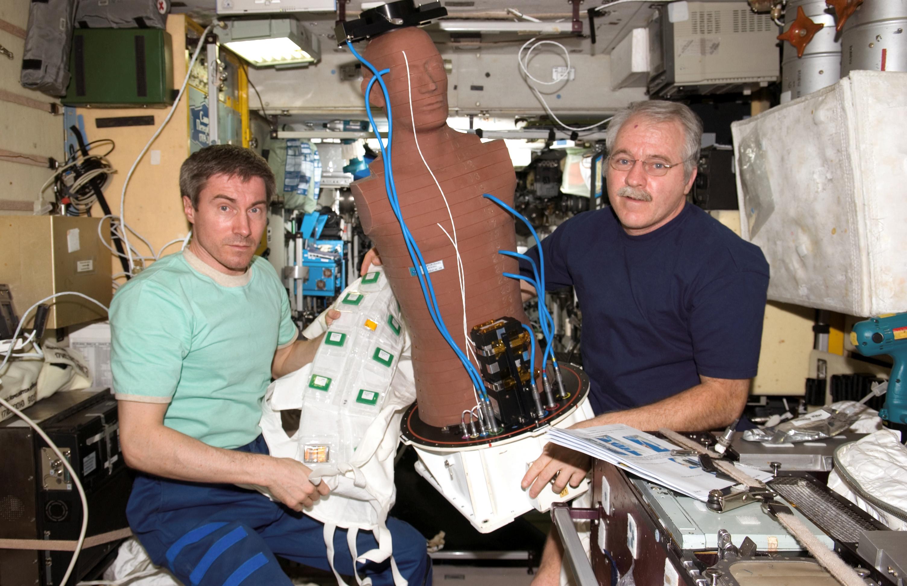 Astronauts Sergei Krikalev (l.) and John Phillips with MATROSHKA, a special mannequin used to measure radiation in space.