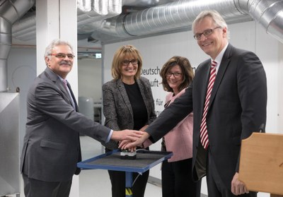 Official inauguration of the Decentralised Energy Technology Platform test facility at the DLR site in Stuttgart. From left to right: Manfred Aigner (Director of the DLR Institute of Combustion Technology), Katrin Schütz (State Secretary at the Baden-Württemberg Ministry of Economics, Labour and Tourism), Anke Kovar (Head of DLR’s Stuttgart site), Karsten Lemmer (DLR Executive Board Member for Innovation, Transfer and Research Infrastructure).
