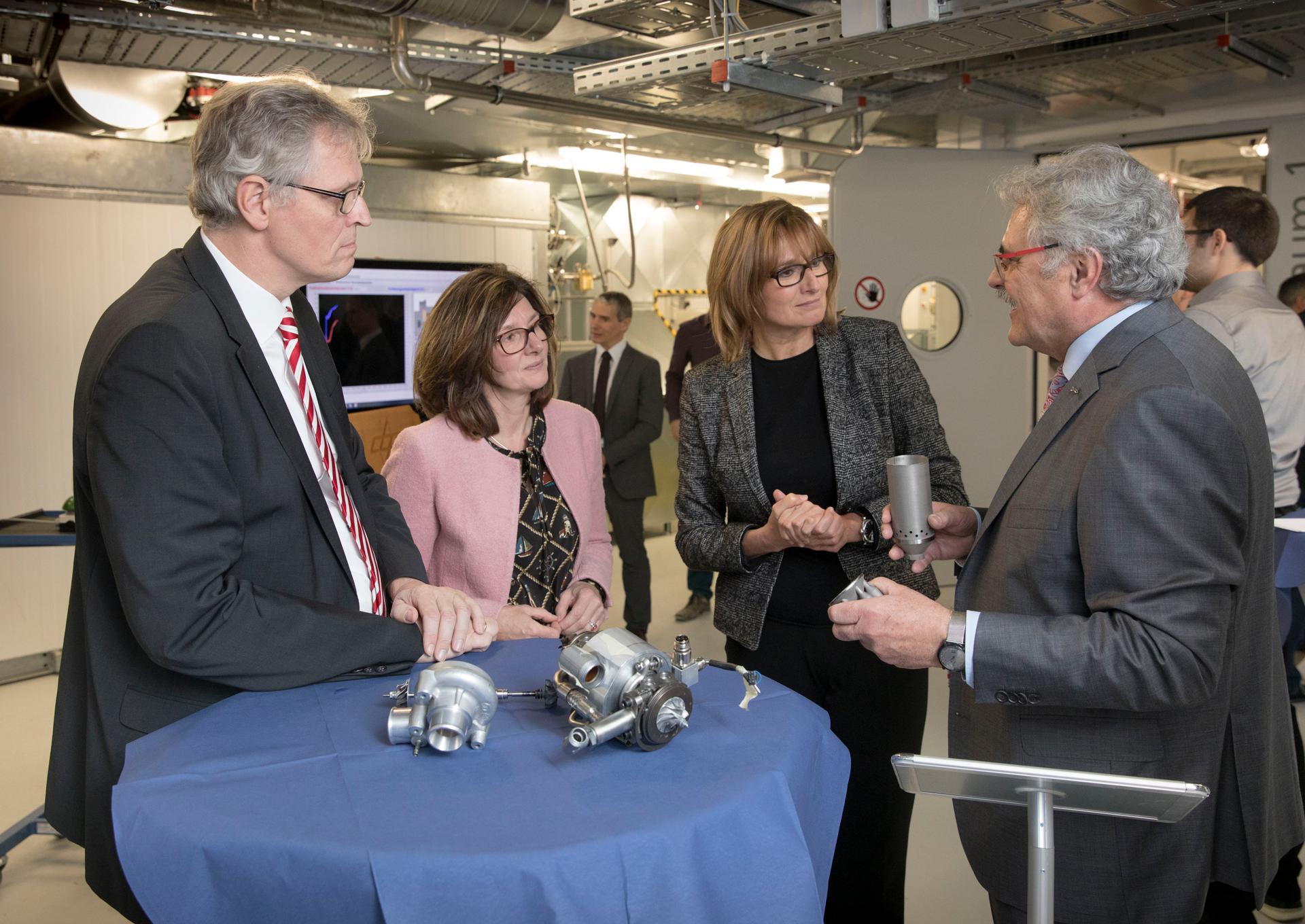 Microgas turbines are at the heart of the Decentralised Energy Technology Platform at the DLR site in Stuttgart. The aim is to develop and test decentralised energy supply concepts that are suitable for everyday use. Manfred Aigner (Director of the DLR Institute of Combustion Technology, right) explains the components of such a microgas turbine (from left to right: Professor Karsten Lemmer, DLR Board Member for Innovation, Transfer and Research Infrastructure; Anke Kovar, Head of DLR’s Stuttgart site; Katrin Schütz, State Secretary at the Baden-Württemberg Ministry of Economics, Labour and Tourism).