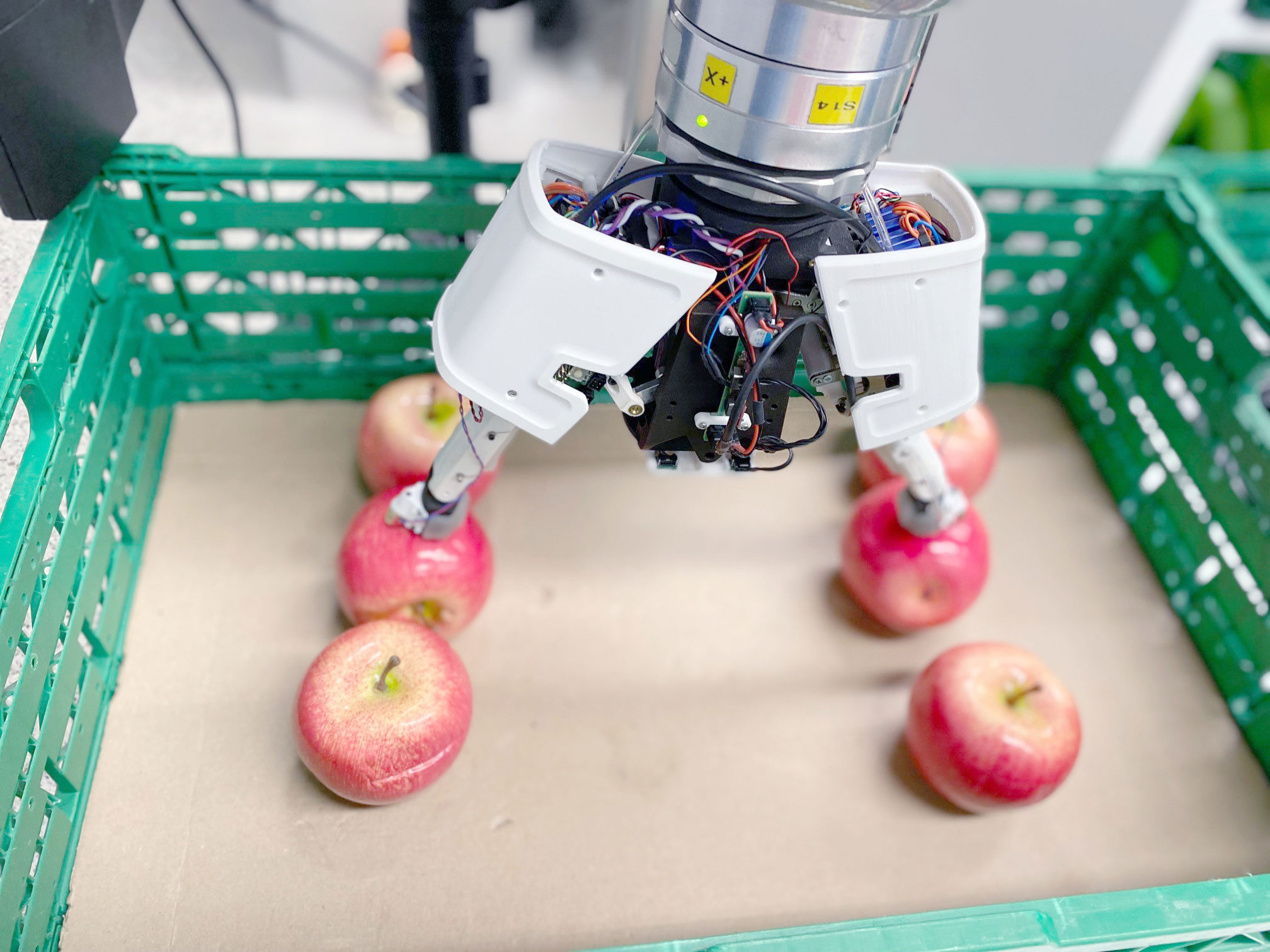 The Hybrid Compliant Gripper (HCG) is based on the thumb modules of the DLR CLASH (Compliant Low-cost Antagonistic Servo Hand). The hybrid gripper is equipped with both a two-finger gripper and vacuum suction cups. This allows it to grip different items in a box full of objects. The two finger modules can also be swivelled so that the gripper can collect two apples at the same time, for example.