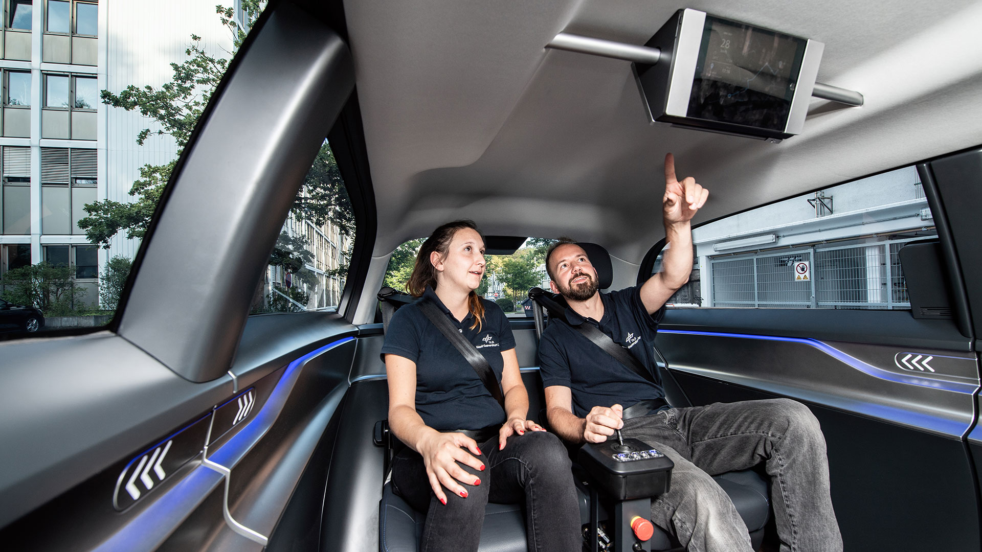 DLR researcher Marco Münster, who is seen here travelling with his colleague Kristiane Schuster, controls the Peoplemover using a joystick. In the future, the vehicle will be able to drive autonomously.
