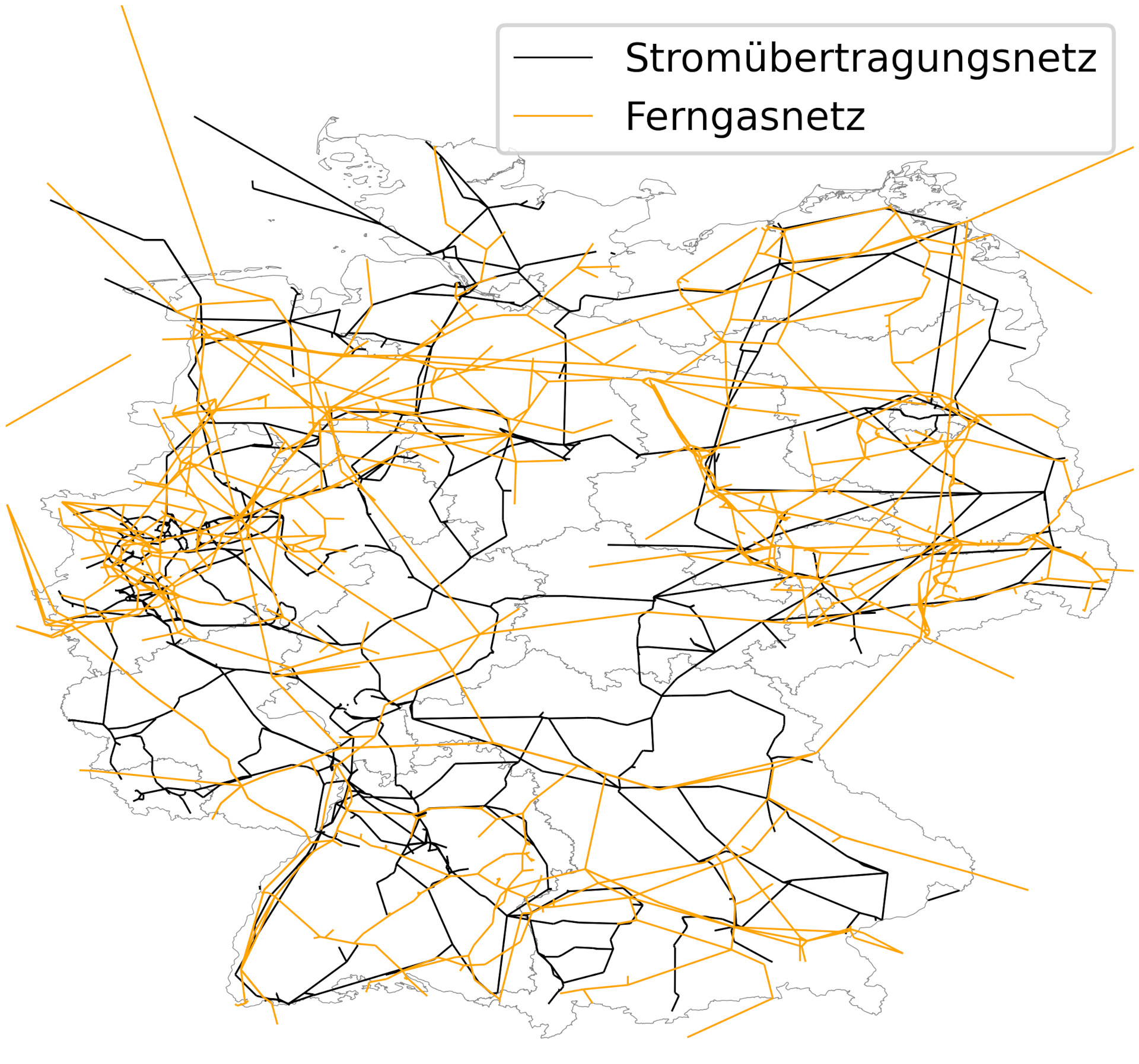 Spatial overlap of the German electricity transmission grid and the gas transport grid to determine power-to-gas connection capacities.