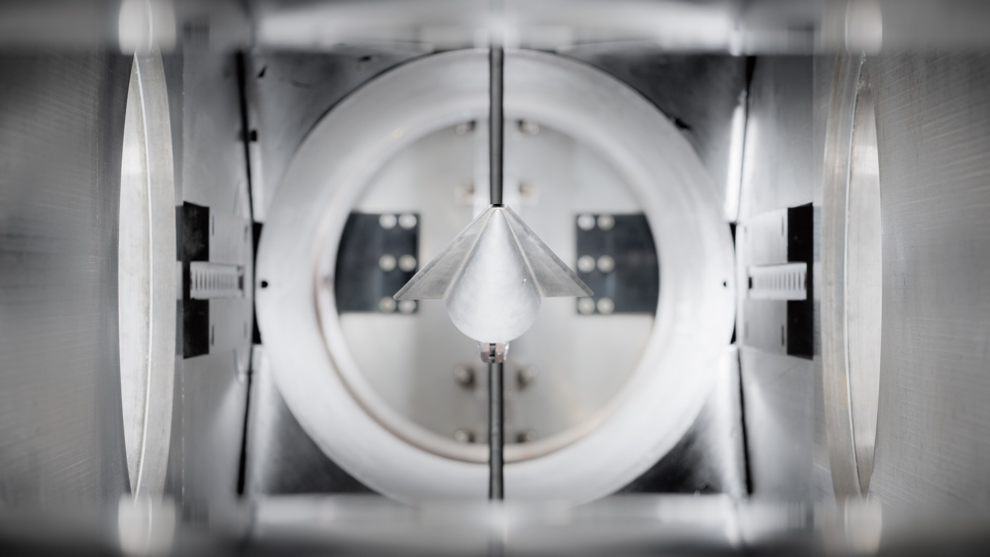 The picture shows the view from the supersonic nozzle of the tubular wind tunnel onto the test model, which is attached to the movable centreboard by means of a holding rod.