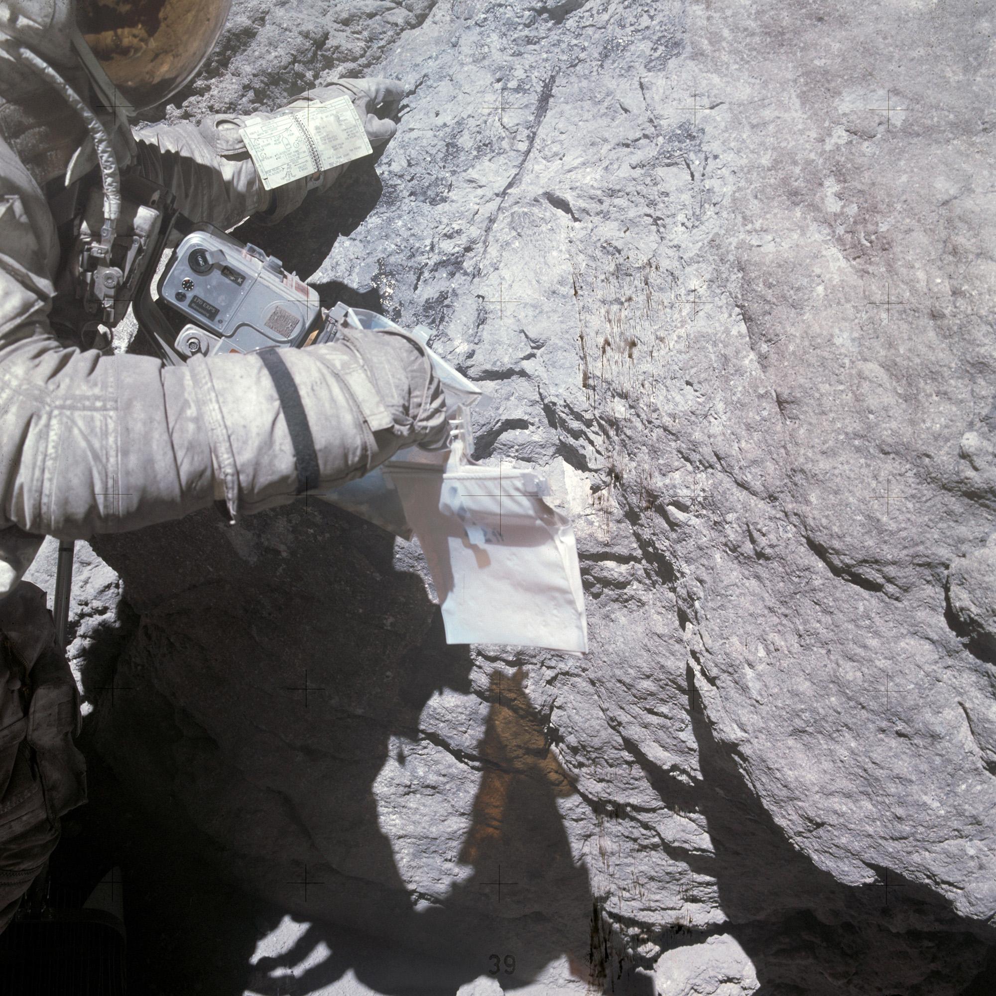 At the Apollo 16 landing site, Charles Duke (image) and John Young were tasked with confirming the geologists’ remote assessment that the landscape was of volcanic origin. They cracked the rocks open with a hammer and observed that they were formed by asteroid impacts - thus refuting the theory.