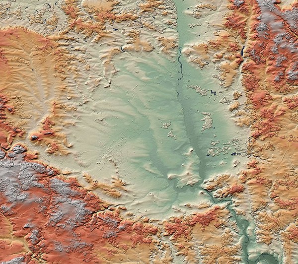 A physical map of the Nördlinger Ries, derived from a colour-coded, diagonally illuminated digital elevation model created using data acquired by TanDEM-X