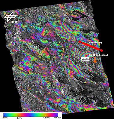The picture from the German TerraSAR-X radar satellite shows the area around the Italian town of L'Aquila after the magnitude 6.3 earthquake which struck on 6 April 2009. Two images from the satellite were combined for the picture into a so-called differential interferogram. For the analysis, two TerraSAR-X images in stripmap mode were used with a resolution of 1.7 x 3.4 metres. The first image was taken on 6 February 2009 and the second on 13 April 2009.