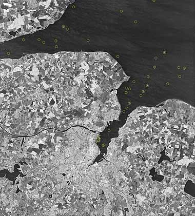 This image – from the German TerraSAR-X radar satellite - shows the city of Kiel and the Kiel Fjord, an approximately 17-km long fjord or firth of the Baltic Sea on the northeastern shore of Schleswig-Holstein. The ships that were in this area at the time the image was captured are each marked with a circle. The high resolution of TerraSAR-X images makes them ideally suitable for the rapid identification of ships. The image was acquired in stripmap mode with a resolution of three metres.