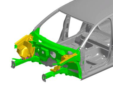 The SuperLIGHT-CAR prototype saves 35 percent in weight in comparison to the reference structure. This ambitious target was achieved by 37 partners in research and in the vehicle and component supply industries, from nine European countries, in the EU SuperLIGHT-CAR project. With the front-end structure, which achieves a weight saving of more than 30 percent, DLR made a significant contribution to the overall concept. This image shows the design of the DLR front-end concept. The magnesium cast strut tower is shown in yellow and the aluminium structures in green.