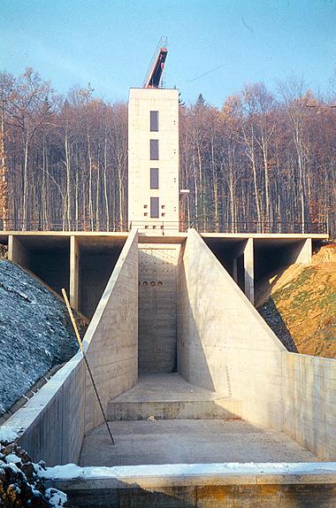 Test stand P2 at Lampoldshausen was designed to test rocket engines in a vertical configuration with thrust up to 100 tons. Its location at the top of a steep incline was particularly advantageous for this purpose. The test stand was built in the early sixties. It is composed of a 30 metre high concrete tower, which is sunk into the ground for half of its height. This meant that the engines could be lowered into the test chamber through the top opening and their exhaust gases vented to the exterior.