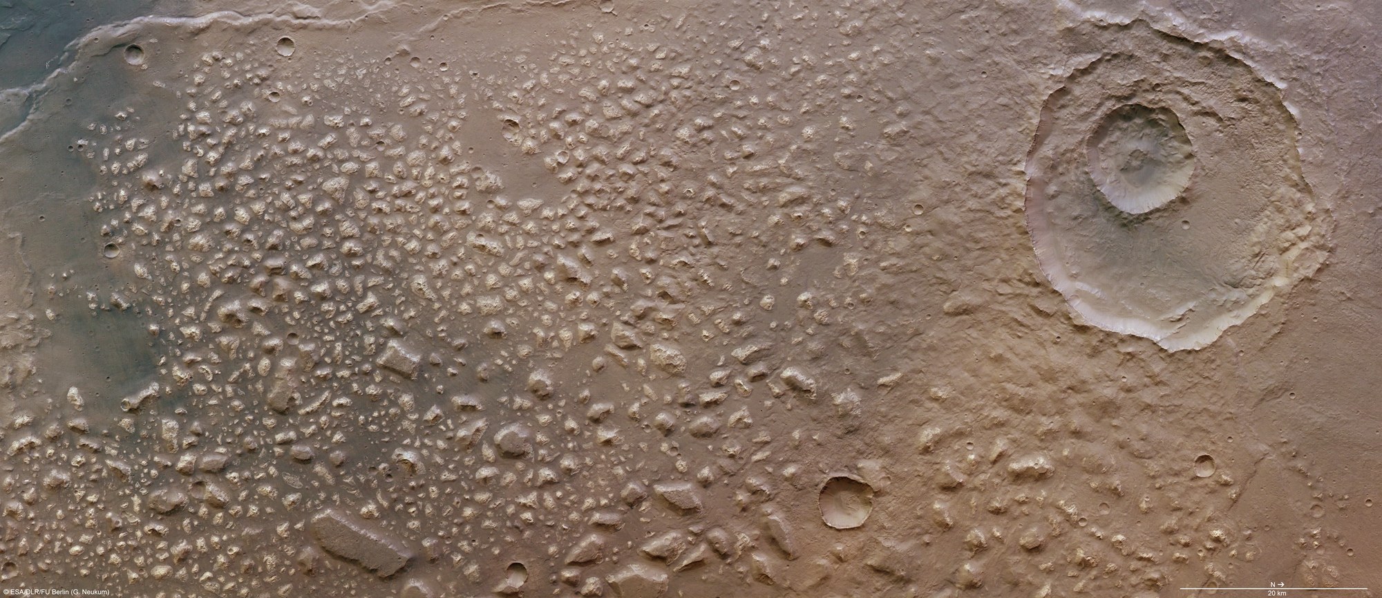 This image, taken by the Mars Express High Resolution Stereo Camera (HRSC) operated by the German Aerospace Center (Deutsches Zentrum für Luft- und Raumfahrt; DLR), shows the region of Ariadnes Colles on the Red Planet.
