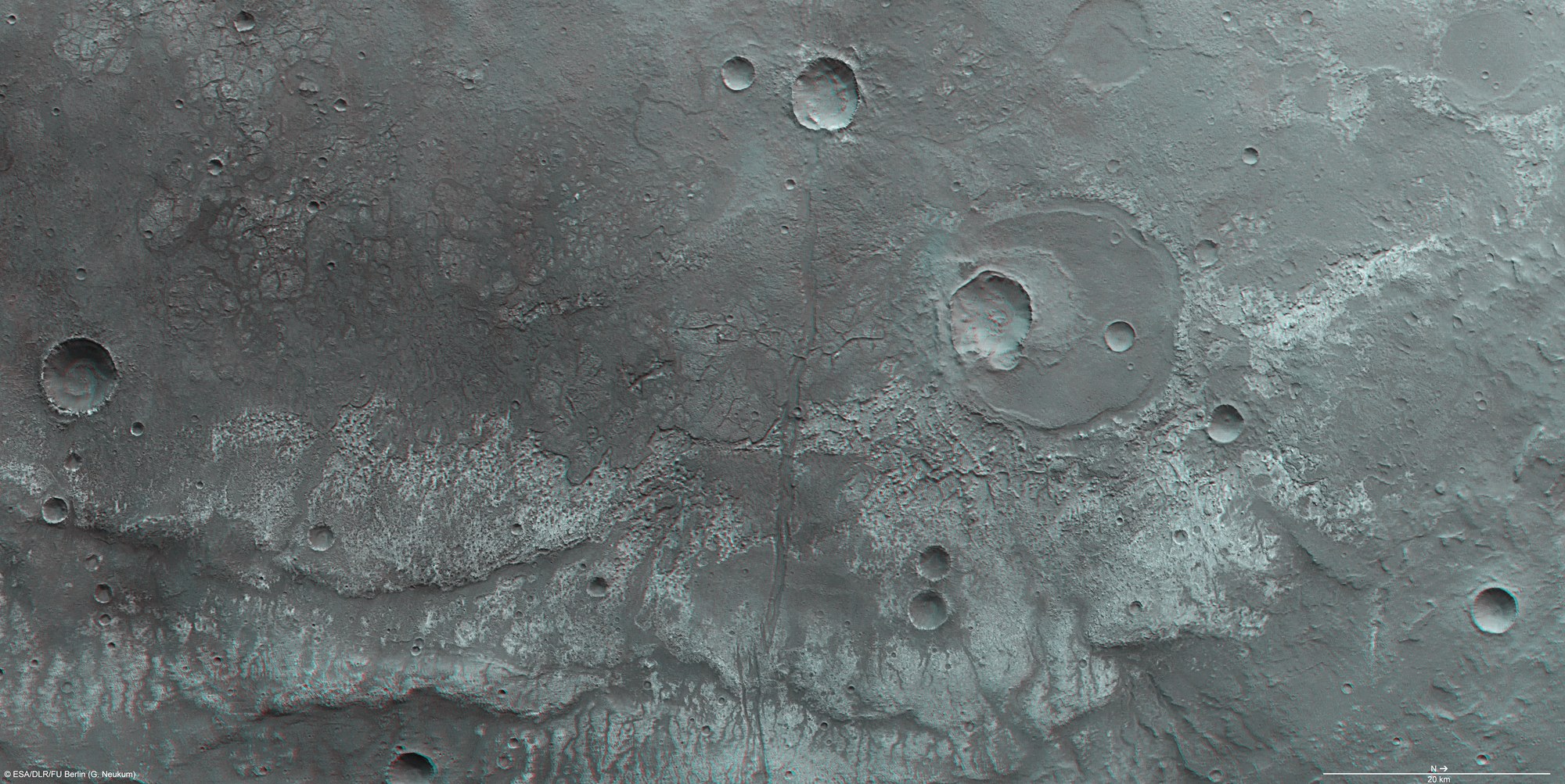 Mars Express 3D image of a region close to Ma’adim Vallis, one of the largest canyons on Mars after Valles Marineris, one of the largest canyons on Mars. The imaged region lies southeast of Ma’adim Vallis; the pictures are centred at about 29°S and 182°E and have a ground resolution of 15 metres per pixel.