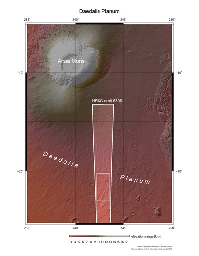 Daedalia Planum is a sparsely cratered, untextured plain that lies to the southeast of Arsia Mons, one of the largest volcanoes on Mars. It is 350 kilometres in diameter and rises 14 kilometres high. The plain is dominated by numerous lava flows of varying ages.