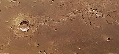 This image of Hephaestus Fossae was obtained on 28 December 2007 by the High Resolution Stereo Camera (HRSC) operated by the German Aerospace Center (Deutsches Zentrum für Luft- und Raumfahrt; DLR) on board the European Space Agency’s Mars Express orbiter. The region is dotted with craters and channel systems and lies at about 21°N and 126°E on the Red Planet. Named after the Greek god of fire, Hephaestus Fossae extends for more than 600 kilometres on the western flank of Elysium Mons in the Utopia Planitia region.