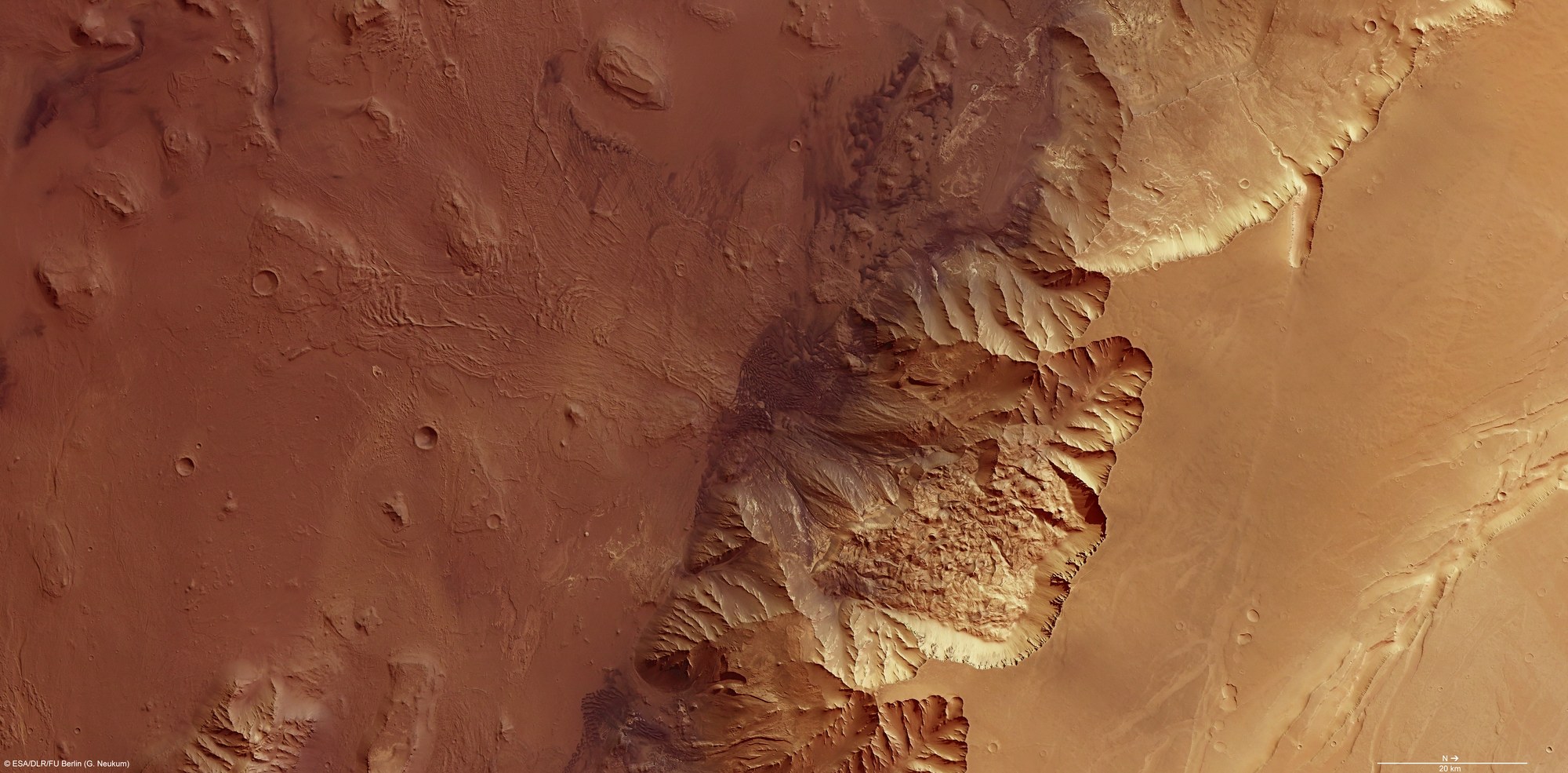 To the left of the image is Melas Chasma, a part of the huge Valles Marineris rift valley, which stretches for more than 4000 kilometres across the face of Mars. Melas Chasma itself sinks 9 kilometres below the surrounding plateau, on the right of the image, making it one of the lowest depressions on Mars.