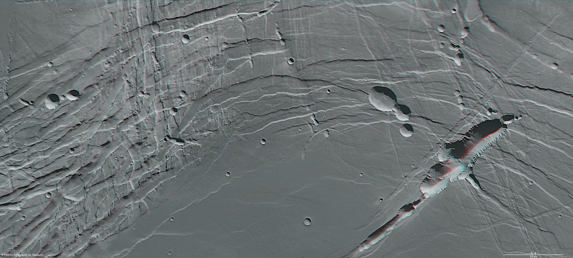 Phoenicis Lacus was formed by the uplift of the Tharsis volcanic plateau. The continual episodes of strong volcanic activity in Tharsis not only lifted the plateau, but also compressed Phoenicis Lacus, creating blocks and multiple fault lines at different orientations. Extension has taken place here, resulting in this characteristic horst-and-graben (cliffs and valleys) landscape. This image was obtained on 31 July 2010 using the High-Resolution Stereo Camera (HRSC) on ESA's Mars Express spacecraft. It combines data from the nadir channel and one stereo channel of HRSC. Stereoscopic glasses are required to see the 3D effect.